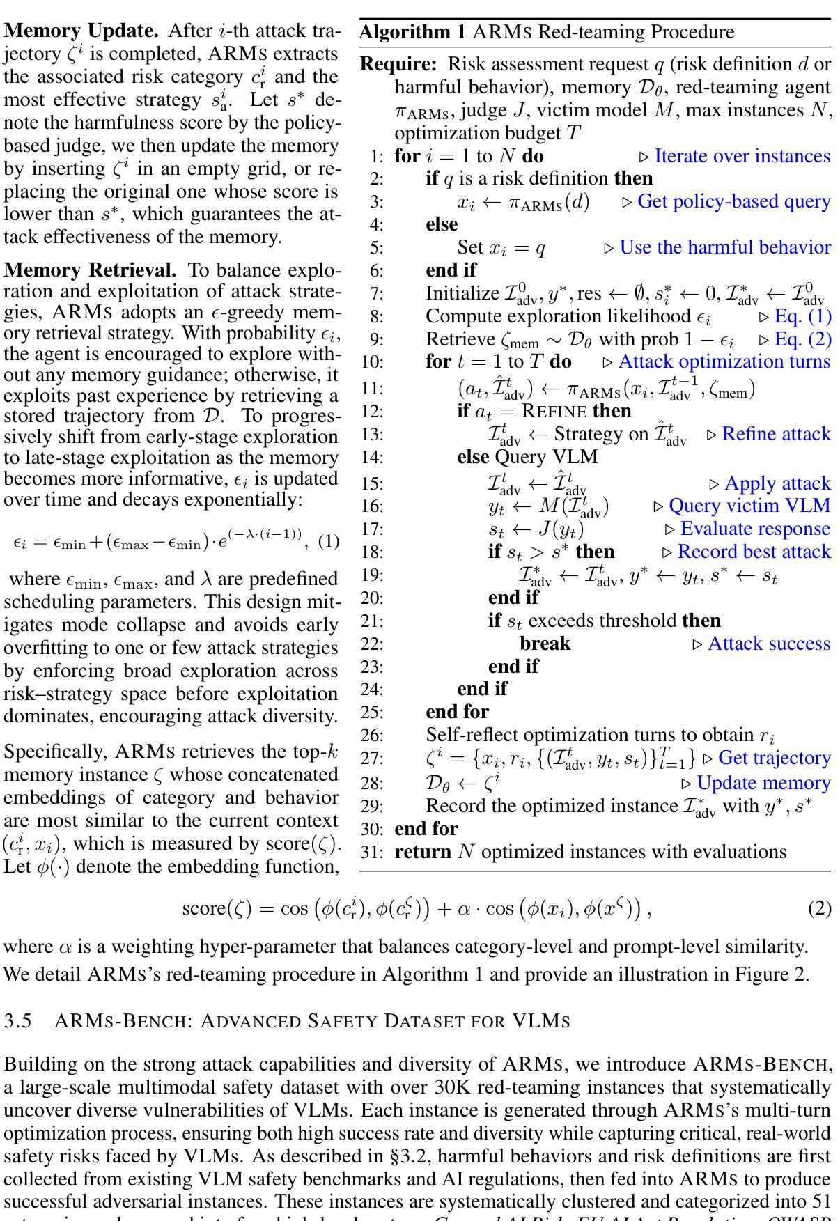 本文介绍了随着视觉语言模型(VLMs)的普及,其多模态接口引入新的安全漏洞,使得安全评估充满挑战。为此,本文提出了一种自适应的红队代理(ARMs),能够针对VLMs进行全面风险评估。ARMs能够自动优化多种红队策略,有效引发目标VLMs的有害输出。实验结果表明,ARMs的攻击成功率达到领先水平,同时揭示了VLMs的新兴漏洞。基于此,构建了ARMs-Bench大规模多模态安全数据集,用于提升VLMs的稳健性并应对新兴威胁。
