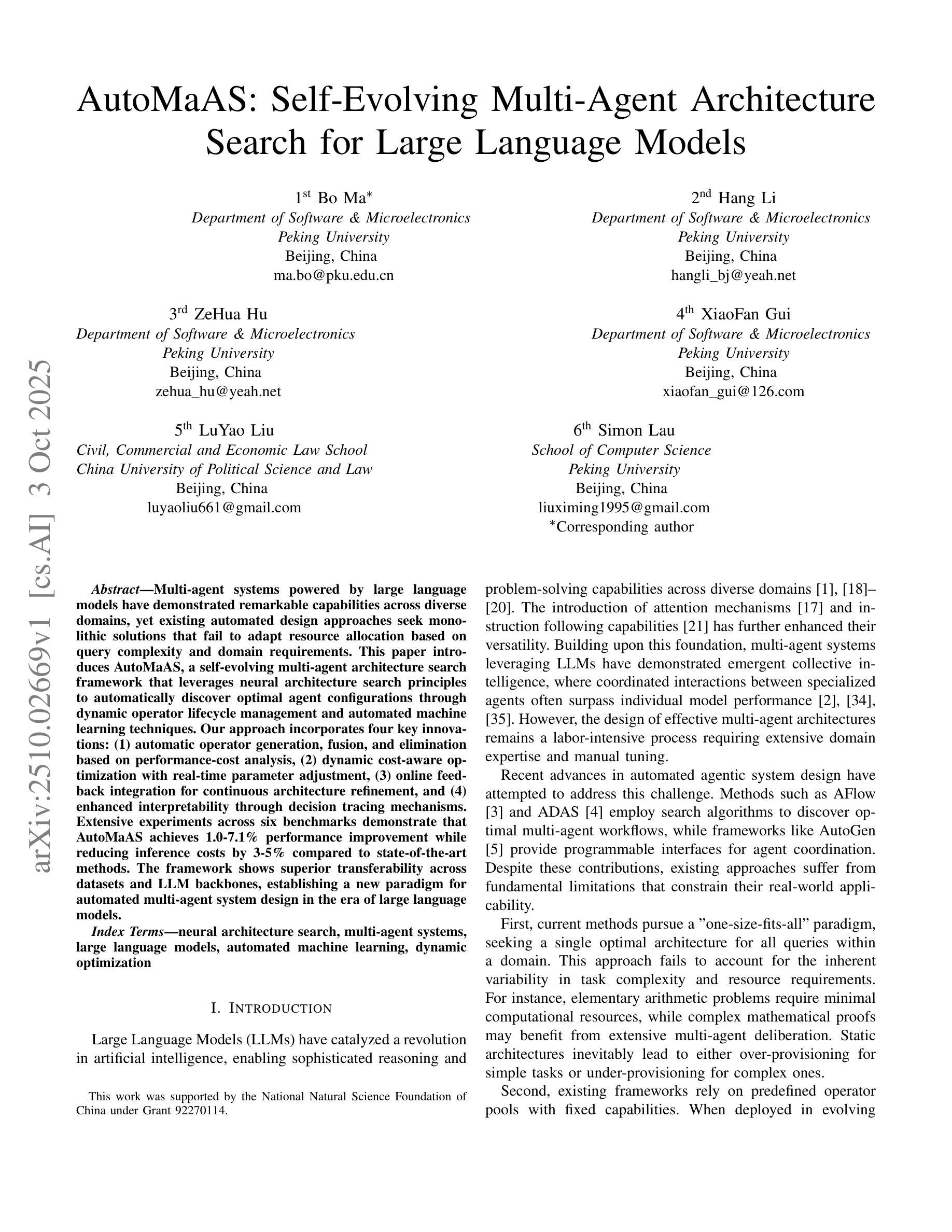 由大型语言模型驱动的多智能体系统已在多个领域展现出卓越的能力。然而,现有的自动化设计方法寻求单一解决方案,无法根据查询复杂性和领域要求调整资源分配。本文介绍了AutoMaAS,一种自我进化的多智能体架构搜索框架,它利用神经网络架构搜索原理,通过动态操作符生命周期管理和自动化机器学习技术,自动发现最佳智能体配置。我们的方法结合了四项关键创新:(1)基于性能成本分析的自动操作符生成、融合和消除;(2)具有实时参数调整的动态成本感知优化;(3)在线反馈集成,用于持续架构改进;(4)通过决策跟踪机制的增强可解释性。在六个基准测试上的大量实验表明,与最先进的方法相比,AutoMaAS实现了1.0-7.1%的性能提升,同时降低了3-5%的推理成本。该框架在数据集和LLM骨干网之间表现出卓越的可迁移性,为大型语言模型时代自动化多智能体系统设计建立了新范式。