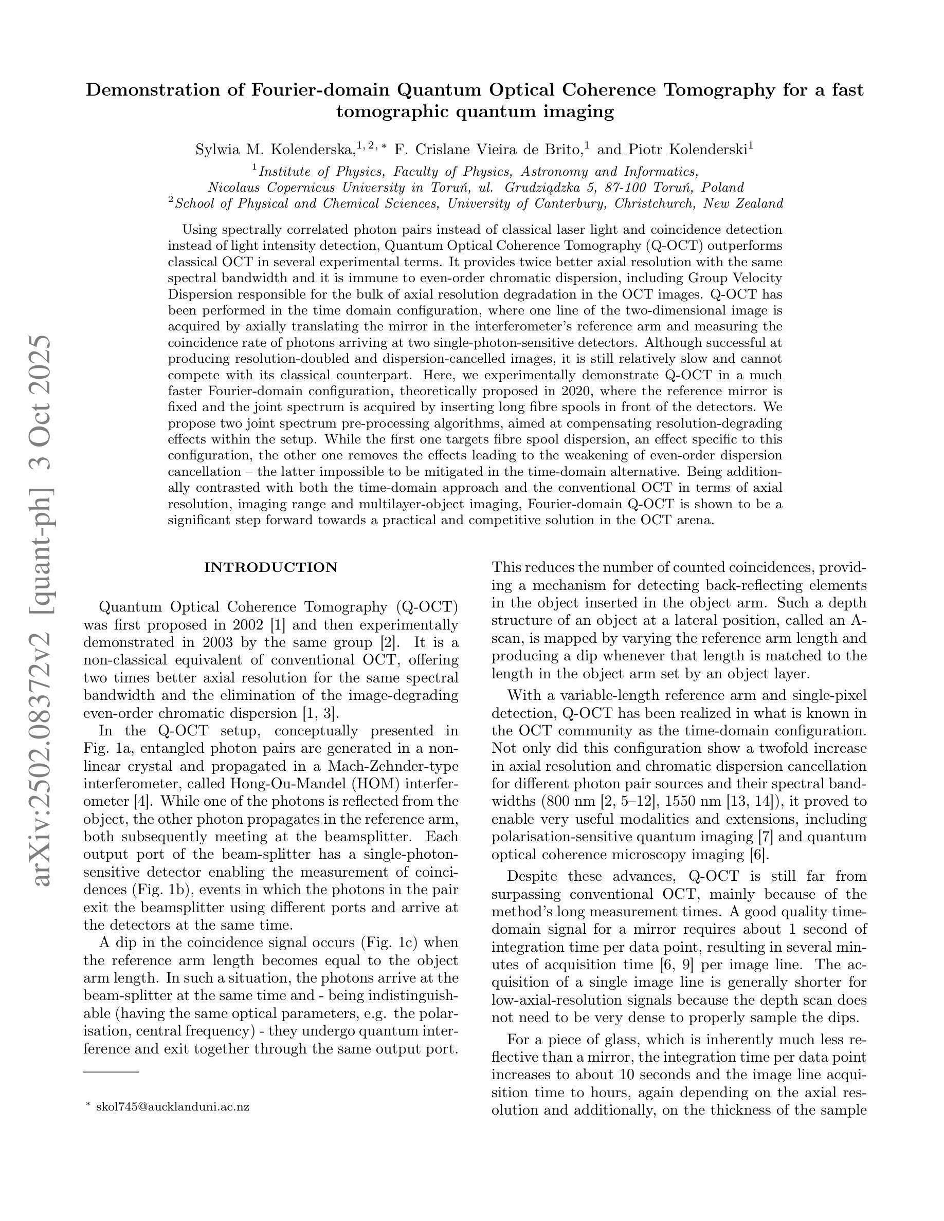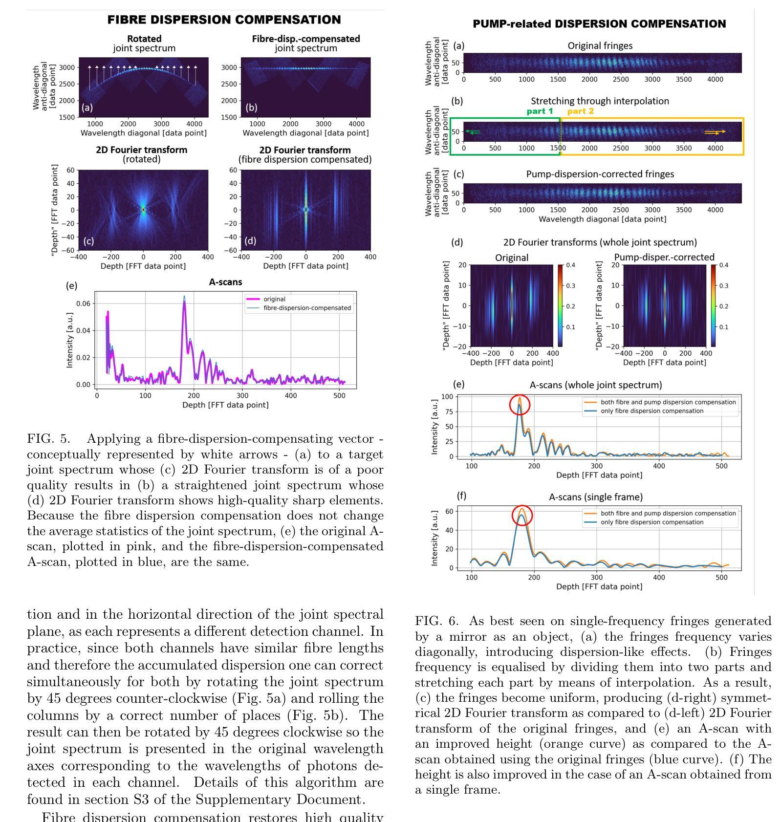 利用光谱相关光子对代替经典激光光,并利用符合检测代替光强度检测,量子光学相干层析成像技术(Q-OCT)在几项实验中表现优于传统OCT。它在相同的光谱带宽下提供了两倍的轴向分辨率,并且对偶数色散具有免疫性,包括由群速度色散导致的OCT图像的大部分轴向分辨率退化。Q-OCT已经在时域配置中进行,通过轴向移动干涉仪参考臂中的镜子并测量到达两个单光子敏感探测器的光子符合率来获取二维图像的一行。尽管已成功产生分辨率加倍和色散取消的图像,但它仍然相对较慢,无法与其经典版本竞争。在这里,我们在实验上展示了在更快的傅立叶域配置中的Q-OCT,该配置在理论上于2020年提出,其中参考镜是固定的,通过探测器前插入长的光纤卷筒来获取联合光谱。我们提出了两种联合光谱预处理算法,旨在补偿设置内的分辨率降低效应。第一个针对光纤卷筒色散这一特定配置的影响,而另一个则消除了导致偶数色散取消失效的因素,后者在时域替代方案中无法缓解。通过与时域方法和传统OCT在轴向分辨率、成像范围和多层对象成像方面进行对比,傅立叶域Q-OCT被证明是朝着实用和竞争性的OCT解决方案迈出的重要一步。