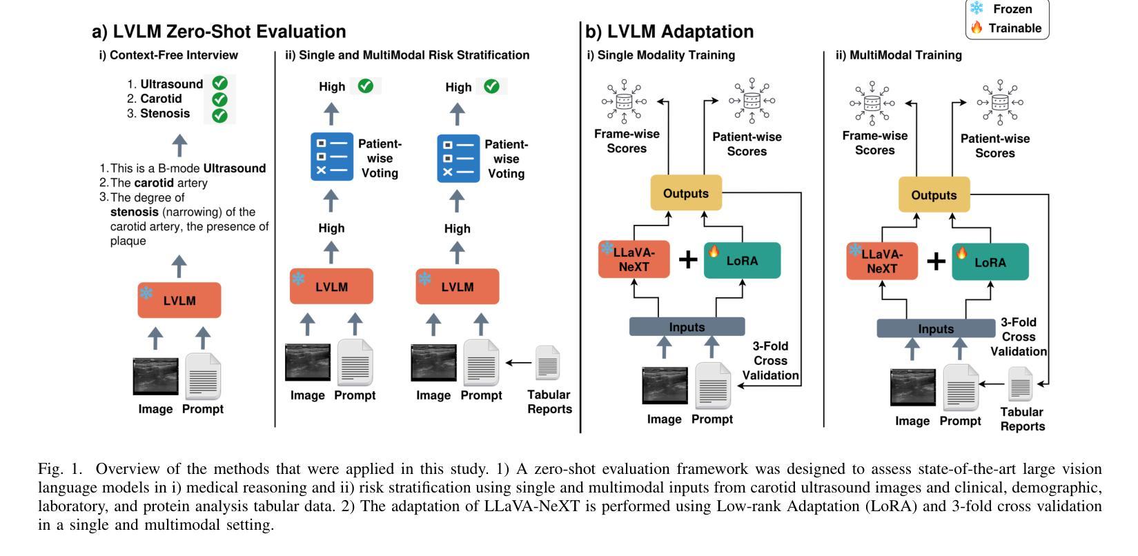 先进的大型视觉语言模型(LVLMs)用于多模态颈动脉斑块评估的研究得到调查。这些模型结合了超声成像与多种临床数据。