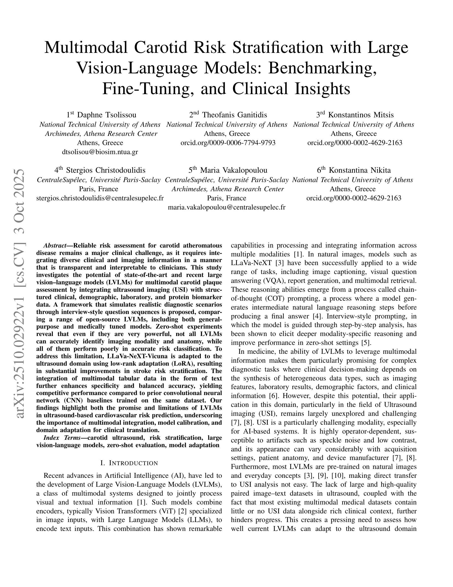 本研究探讨了最先进的大型视觉语言模型(LVLMs)在多模态颈动脉斑块评估中的潜力,通过整合超声成像与结构化临床、人口学、实验室和蛋白质生物标志物数据,模拟真实诊断场景。研究发现,虽然LVLMs功能强大,但并不是所有模型都能准确识别成像模态和解剖结构,且在风险分类方面的表现较差。通过适应LoRA的LLaVa-NeXT-Vicuna模型在超声领域的应用,对中风风险分层有了显著改善。多模态表格数据的文本形式整合进一步提高了特异性和平衡精度,与在同一数据集上训练的卷积神经网络(CNN)基准测试相比具有竞争力。研究结果强调了LVLMs在超声心动图风险预测中的前景和局限性,突出了多模态整合、模型校准和领域适应对于临床转化的重要性。