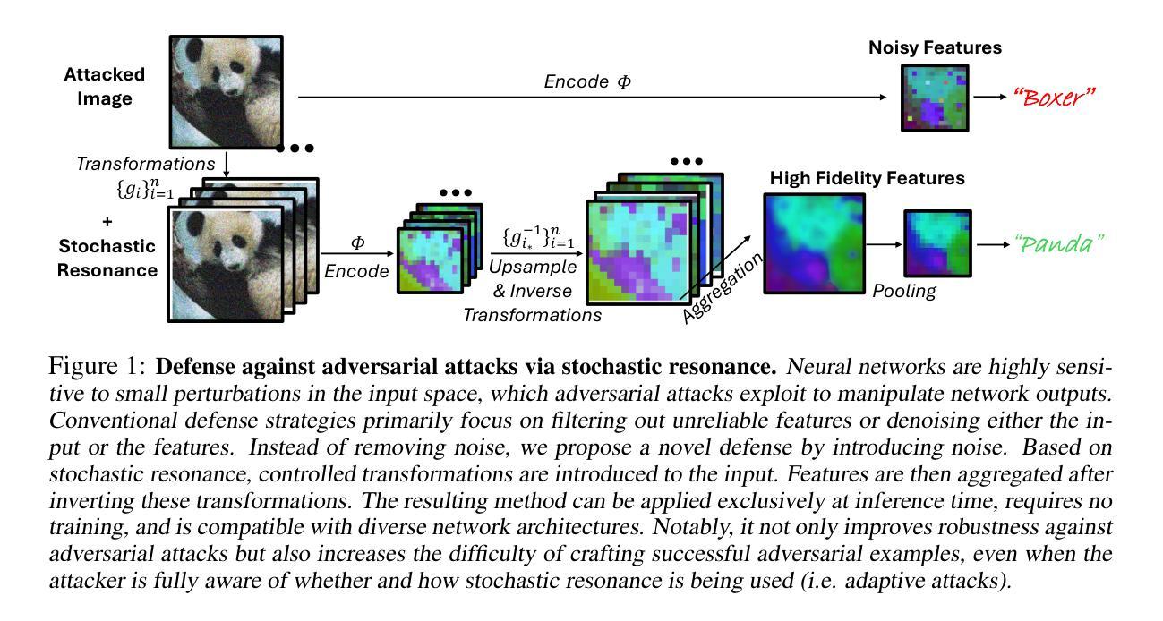 我们提出了一种针对对抗性攻击的测试时防御机制:即对图像进行细微的、难以察觉的扰动,从而显著改变模型的预测结果。与依赖特征过滤或平滑的现有方法不同,这些方法可能导致信息丢失,我们提出通过利用随机共振来增强鲁棒性,同时尽量减少信息损失,以“以噪声对抗噪声”的方式应对。我们的方法在输入图像上引入微小的平移扰动,对齐变换后的特征嵌入,将它们聚合,然后映射回原始参考图像。这可以用封闭形式的公式来表示,可以在各种现有的网络架构上部署,而无需引入额外的网络模块或为特定的攻击类型进行微调。所得方法完全无需训练、不受架构限制,且不受攻击影响。经验结果表明,该方法在图像分类方面达到了最先进的稳健性,并且首次为密集预测任务建立了通用的测试时防御机制,包括立体匹配和光流,这突出了该方法的通用性和实用性。具体来说,相对于清洁(无扰动)的性能,我们的方法在图像分类上恢复了高达68.1%的精度损失,在立体匹配上恢复了71.9%,在光流上恢复了29.2%,在各种类型的对抗性攻击下表现良好。