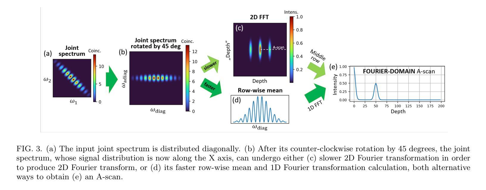 量子光学相干层析术(Q-OCT)采用光谱相关光子对替代经典激光光,并使用符合检测替代光强度检测,表现出优于传统OCT的性能。它在实验条件下提供了两倍的轴向分辨率,相同的谱带宽,且不受偶数色散影响,包括导致OCT图像大部分轴向分辨率退化的群速度色散。尽管成功实现了分辨率加倍和色散消除的图像,但Q-OCT仍然相对较慢,无法与传统技术竞争。本文在实验上展示了更快的傅立叶域配置的Q-OCT理论方案,在该方案中参考镜是固定的,通过探测器前插入长光纤线轴获得联合光谱。本文提出了两种联合光谱预处理算法,旨在补偿系统内的分辨率退化效应。第一种旨在针对此特定配置的光纤线圈色散问题;另一种消除了导致偶数色散取消无效的因素,后者在时域替代中无法缓解。与使用时域方法和传统OCT的轴向分辨率、成像范围和多层对象成像进行对比后,傅立叶域Q-OCT被认为是朝着实用和竞争性的OCT解决方案的重要一步。