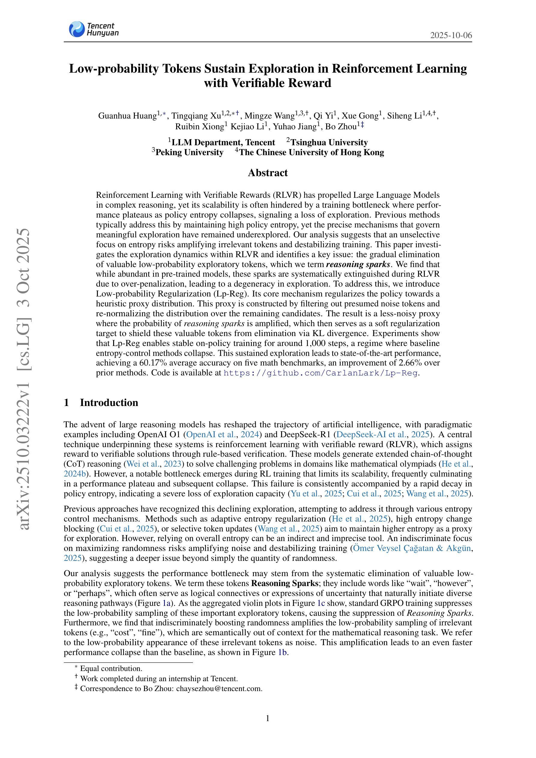 强化学习与可验证奖励(RLVR)在推动大型语言模型进行复杂推理方面取得了进展,但其可扩展性经常受到训练瓶颈的阻碍,表现为性能平台化,标志着探索的丧失。之前的方法通常通过保持高政策熵来解决这一问题,但精确控制有意义探索的机制仍然知之甚少。本文分析了RLVR中的探索动态,并发现了一个关键问题:宝贵的低概率探索性令牌(“推理火花”)的逐渐消除。尽管这些火花在预训练模型中非常丰富,但在RLVR中却被系统消除,原因是过度惩罚导致探索退化。为了解决这一问题,我们引入了低概率正则化(Lp-Reg)。其核心机制是对策略进行正则化,使其朝向启发式代理分布。该代理通过过滤掉假定为噪声令牌并重新归一化剩余候选者的分布来构建。结果是一个噪声较少的代理,其中推理火花的可能性被放大,然后作为软正则化目标,通过KL散度保护这些有价值的令牌免受消除。实验表明,Lp-Reg能够在大约1000步内实现稳定的在策略训练,这是基线熵控制方法崩溃的时期。这种持续的探索导致了最先进的性能,在五个数学基准测试上平均准确度达到60.17%,比先前的方法提高了2.66%。代码可在https://github.com/CarlanLark/Lp-Reg找到。