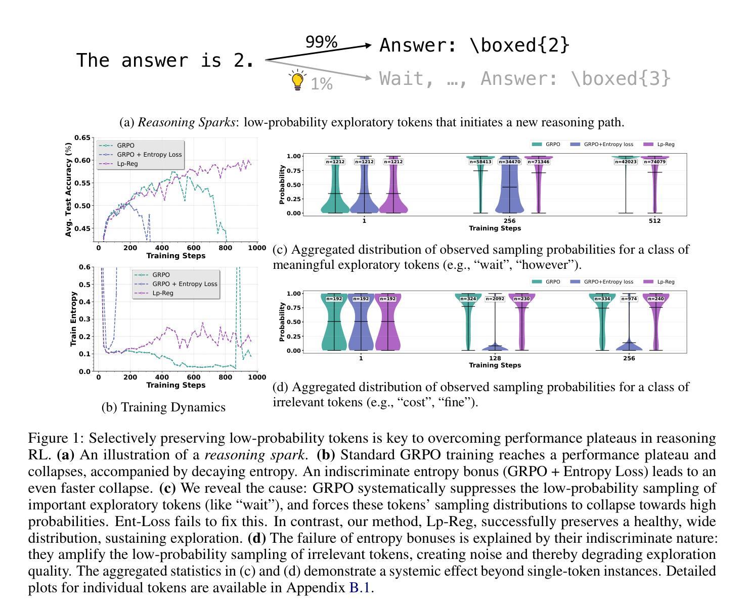 - 本文发现低概率探索性令牌(推理火花)的逐渐消除是关键问题。
