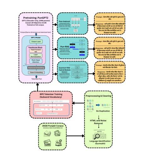 尽管大型语言模型(LLM)迅速进步,但低资源语言仍然被排除在NLP之外,限制了数百万人的数字访问。我们推出了PunGPT2,这是第一个完全开源的旁遮普语生成模型套件,它基于一个包含文献、宗教文本、新闻、社会话语等内容的35GB语料库进行训练。PunGPT2通过针对古尔姆基和沙姆基脚本优化的分词器捕捉旁遮普语的句法和形态丰富性。我们引入了Pun-RAG,这是一个结合了PunGPT2与针对精选旁遮普知识库的FAISS检索器的检索增强框架,以及Pun-Instruct,这是一个使用QLoRA进行稳健的零射击摘要、翻译和问答的指令调整变体。我们的关键创新是Quantum-RAG,它融合了稀疏、密集和量子核嵌入,用于实现具有低内存开销的高效、上下文感知检索,这是低资源LLM中首个实用的量子启发式检索。我们的模型在FLORES-200、IndicGenBench和新的PunjabiEval套件上的表现超过了多语言基线(mBERT、mT5、MuRIL、BLOOM)。Quantum-RAG在PunjabiEval上的Recall@10比FAISS高出7.4,BLEU比mT5高出3.5。我们公开发布所有的训练脚本、超参数、评估管道、35GB的旁遮普语料库、PunjabiEval基准测试以及所有的模型权重,为旁遮普语的语言生成和检索树立了新的最新成果。