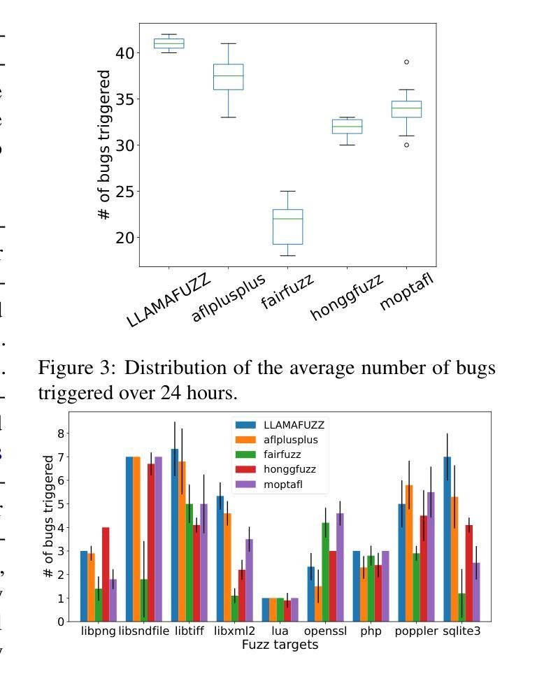 - LLAMAFUZZ发现了更多的独特bug,并且在bug触发和检测方面表现稳定。