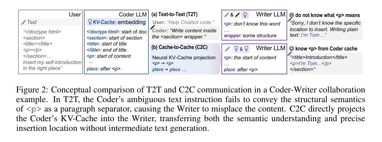 - C2C利用神经网络投影和融合模型KV缓存,实现语义直接传递。