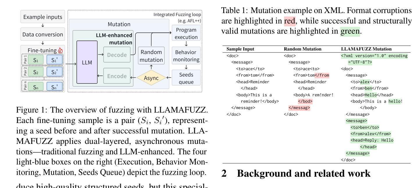 - LLAMAFUZZ利用LLM的预训练知识生成新的有效输入并学习结构化数据和突变策略。