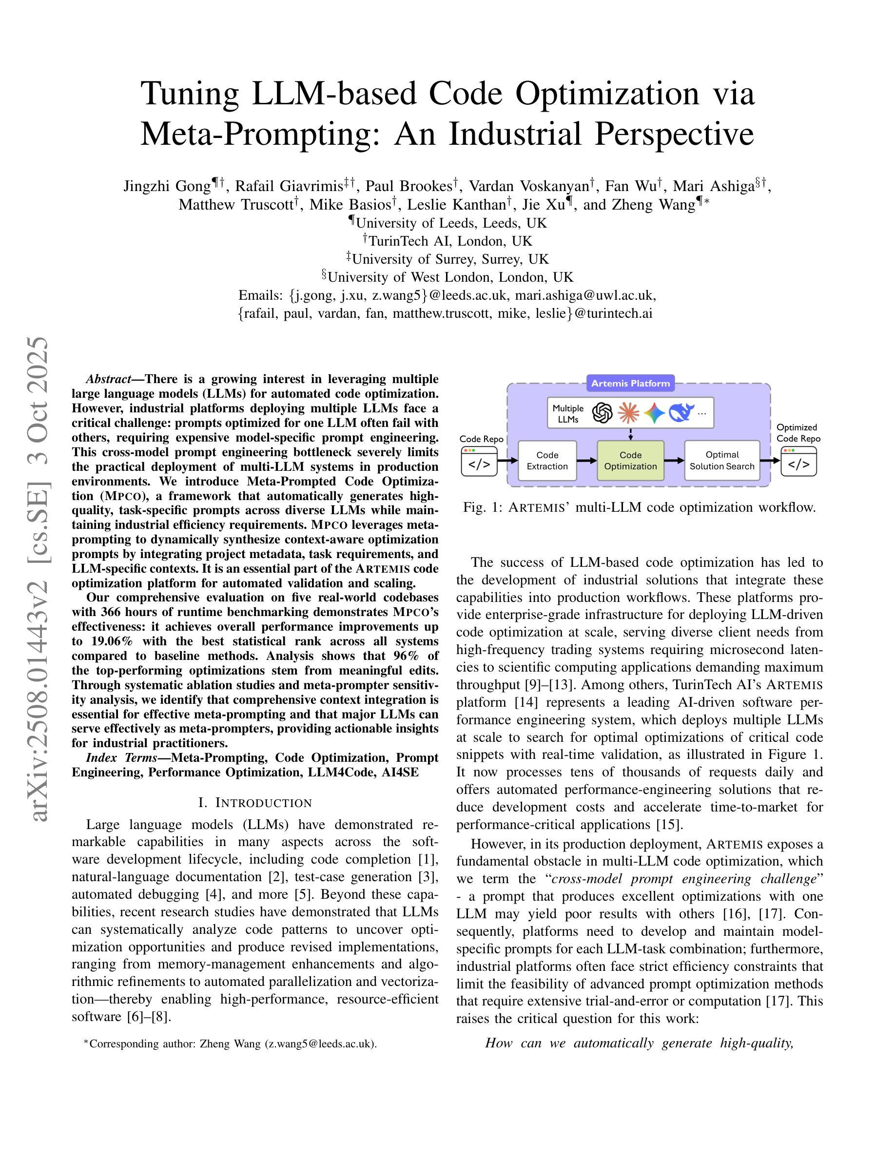 该文本介绍了如何利用多个大型语言模型(LLM)进行自动化代码优化的问题。针对部署多个LLM的工业平台面临的关键挑战,即针对一个LLM优化的提示在其它LLM上经常失效,需要昂贵的模型特定提示工程。为此,引入了Meta-Prompted代码优化(MPCO)框架,该框架能够自动生成高质量的任务特定提示,适用于不同的LLM,同时满足工业效率要求。MPCO利用元提示技术,通过整合项目元数据、任务要求和LLM特定上下文,动态合成上下文感知的优化提示。它是ARTEMIS代码优化平台的重要组成部分,用于自动化验证和扩展。在五个真实世界代码库上的综合评估显示,MPCO总体上提高了高达19.06%的性能,并且在所有系统中表现最佳。分析表明,96%的最佳优化来自于有意义的编辑。通过系统的剖析研究和元提示敏感性分析,发现全面的上下文整合对于有效的元提示至关重要,主要LLM可以有效地作为元提示器,为工业从业者提供可操作的见解。
