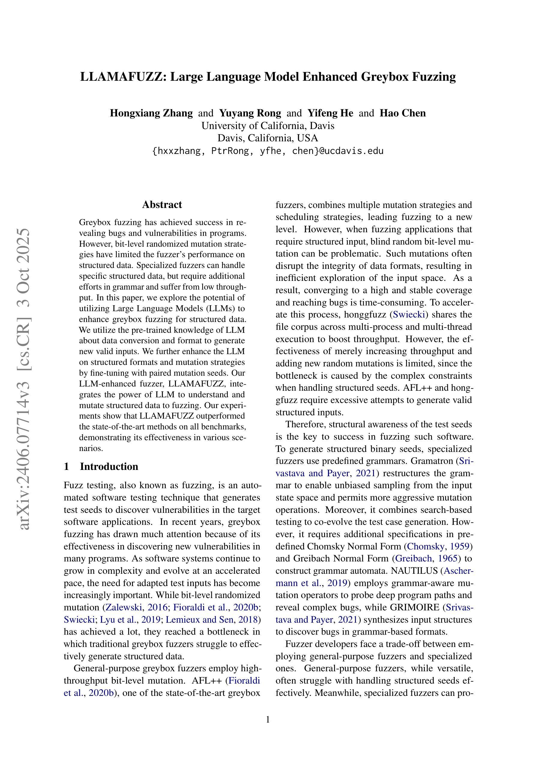 灰盒模糊测试在揭示程序和漏洞中的错误方面取得了成功。然而,随机突变策略在结构化数据上限制了模糊测试的性能。专业模糊测试器可以处理复杂结构化数据,但需要额外的语法努力,并且吞吐量较低。在本文中,我们探讨了利用大型语言模型提升结构化数据的灰盒模糊测试潜力。我们利用LLM关于数据转换和格式的预训练知识来生成新的有效输入。我们进一步使用配对突变种子对其进行微调,以有效学习结构化格式和突变策略。我们基于LLM的模糊测试器LLAMAFUZZ结合了LLM理解和突变结构化数据的能力来进行模糊测试。我们在基于错误的基准测试Magma和各种实际程序上进行了实验。LLAMAFUZZ平均比我们的顶级竞争对手多发现了41个错误。我们还识别出了所有试验中的47个独特错误。此外,LLAMAFUZZ在触发错误和达到错误方面都表现出了一致的性能。与AFL++相比,LLAMAFUZZ在真实程序集上的平均分支覆盖率提高了27.19%。我们还通过一个案例研究来解释LLM如何提升模糊测试过程中的代码覆盖率。
