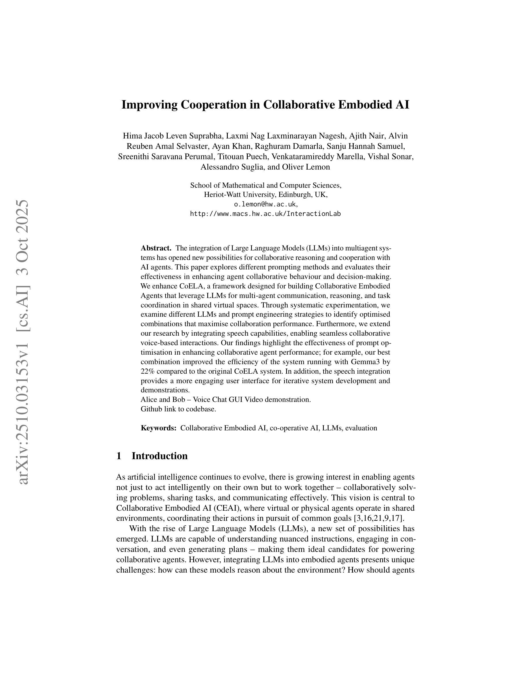 大型语言模型(LLM)多智能体系统的集成开启了协作推理和智能体协作的新可能性。本文探讨了不同的提示方法,并评估了它们在提高智能体协作行为和决策制定方面的有效性。我们增强了CoELA框架,该框架旨在利用LLM构建协作实体智能体,用于共享虚拟空间中的多智能体通信、推理和任务协调。通过系统实验,我们研究了不同的LLM和提示工程策略,以找出优化组合,最大化协作性能。此外,我们通过集成语音功能,实现无缝的基于语音的协作交互。研究结果表明提示优化在提高协作智能体性能方面的有效性;例如,我们的最佳组合将使用Gemma3的系统运行效率提高了22%,与原始CoELA系统相比。此外,语音集成为用户提供了一个更具吸引力的界面,用于迭代系统开发和演示。