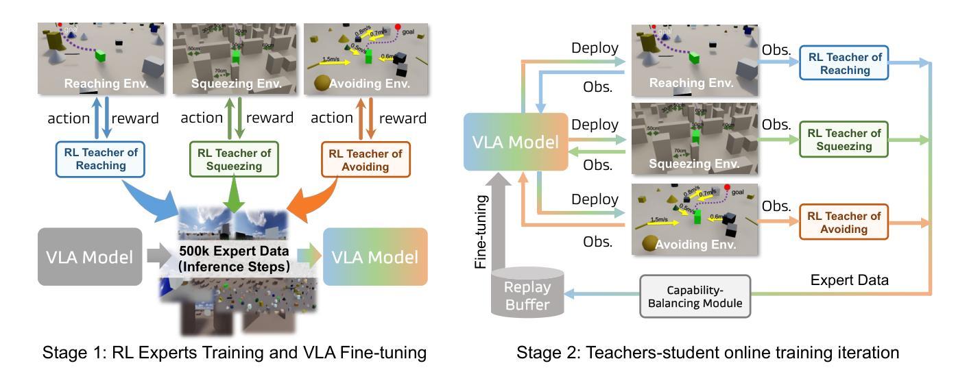 视觉导航策略被广泛认为是一个具有前景的方向,因为它通过使用以自我为中心的视觉观察来模仿人类的导航方式。然而,视觉观察的光学信息难以像激光雷达点云或深度地图那样进行显式建模,这需要智能模型和大规模数据。为此,我们提出利用视觉-语言-动作(VLA)模型的智能,以师徒方式从合成专家数据中学习各种导航能力。具体来说,我们实现了VLA模型MM-Nav,它是一种基于预训练的大型语言模型和视觉基础模型的多视角VLA(具有360度观察)。对于大规模导航数据,我们从三位强化学习(RL)专家收集专家数据,这些专家使用特权深度信息在三个针对不同导航能力量身定制的挑战环境中接受训练:到达、挤压和避免。我们迭代地使用来自RL专家的在线收集数据来训练我们的VLA模型,其中训练比例是根据个人能力的表现进行动态平衡的。通过合成环境的广泛实验,我们证明我们的模型具有很强的泛化能力。此外,我们发现我们的学生VLA模型的表现优于RL老师,这证明了整合多种能力的协同作用。大量现实世界实验进一步证实了我们的方法的有效性。