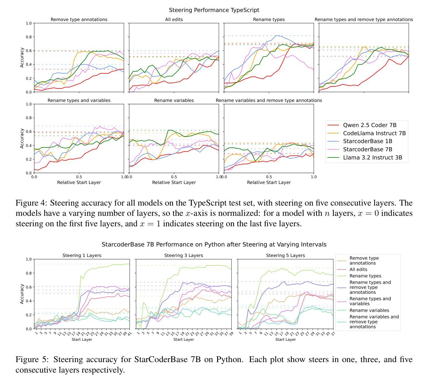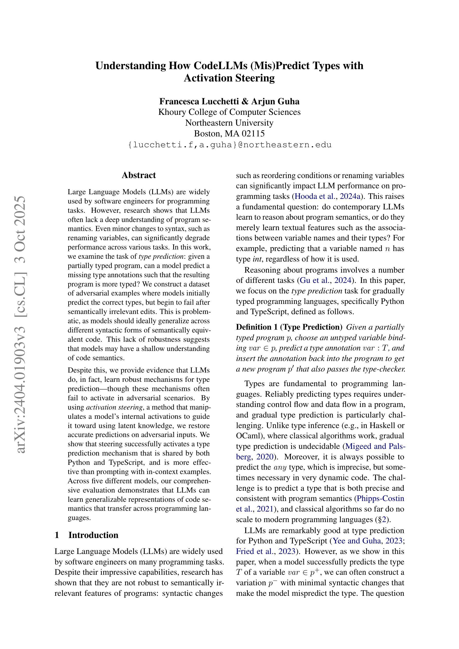 大型语言模型(LLM)被软件工程师广泛应用于编程任务。然而,研究表明,LLM通常缺乏对程序语义的深入理解。即使是对语法的微小更改,如变量重命名,也可能在各种任务中显著降低性能。在这项工作中,我们研究了类型预测任务:给定一个部分类型的程序,模型能否预测缺失的类型注释,以使程序更具类型化?我们构建了一个对抗性示例数据集,模型最初预测的类型是正确的,但在语义无关编辑后开始失败。这是一个问题,因为模型理想情况下应该能够概括语义等效代码的不同语法形式。这种稳健性的缺乏表明,模型可能对代码语义的理解很浅薄。尽管如此,我们提供了证据表明LLM实际上学习了用于类型预测的稳定机制——尽管这些机制在对抗场景中往往无法激活。通过使用激活转向(一种通过操纵模型的内部激活来引导其使用潜在知识的方法),我们恢复了对抗性输入上的准确预测。我们证明了转向成功地激活了Python和TypeScript共有的类型预测机制,并且比使用上下文示例进行提示更为有效。我们在五个不同模型上的全面评估表明,LLM可以学习可概括的代码语义表示,这些表示可以跨编程语言进行迁移。