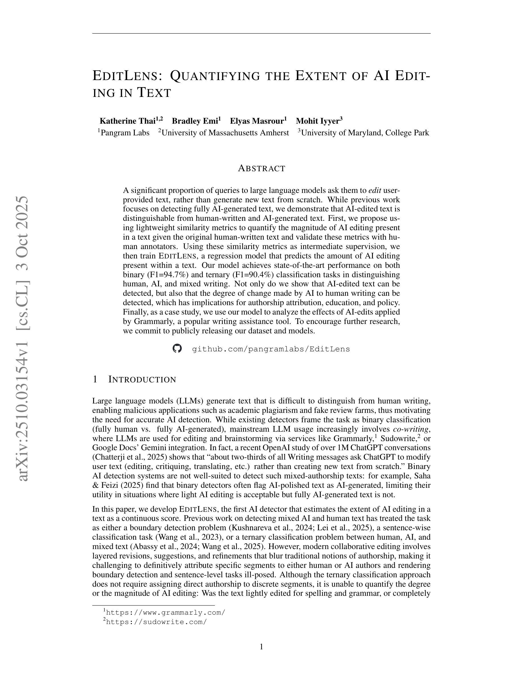 很大一部分对大型语言模型的查询要求它们编辑用户提供的文本,而不是从头开始生成新文本。虽然之前的工作主要集中在检测完全由人工智能生成的文本,但我们证明人工智能编辑的文本与人类书写和人工智能生成的文本是可以区分的。首先,我们提出使用轻量级相似度度量标准来衡量给定原始人类书写文本中AI编辑的程度,并使用人类注释者对这些度量标准进行验证。使用这些相似度度量作为中间监督,我们然后训练了EditLens,一个回归模型,可以预测文本中AI编辑的程度。我们的模型在二元(F1=94.7%)和三元(F1=90.4%)分类任务中实现了区分人类、人工智能和混合写作方面的最新技术性能。我们不仅证明了可以检测到AI编辑的文本,而且证明了可以检测到AI对人类写作所做的改变程度,这对作者归属、教育和政策都有影响。最后,作为一个案例研究,我们使用我们的模型分析了流行写作助手Grammarly应用的AI编辑的影响。为了鼓励进一步研究,我们承诺公开发布我们的模型和数据集。