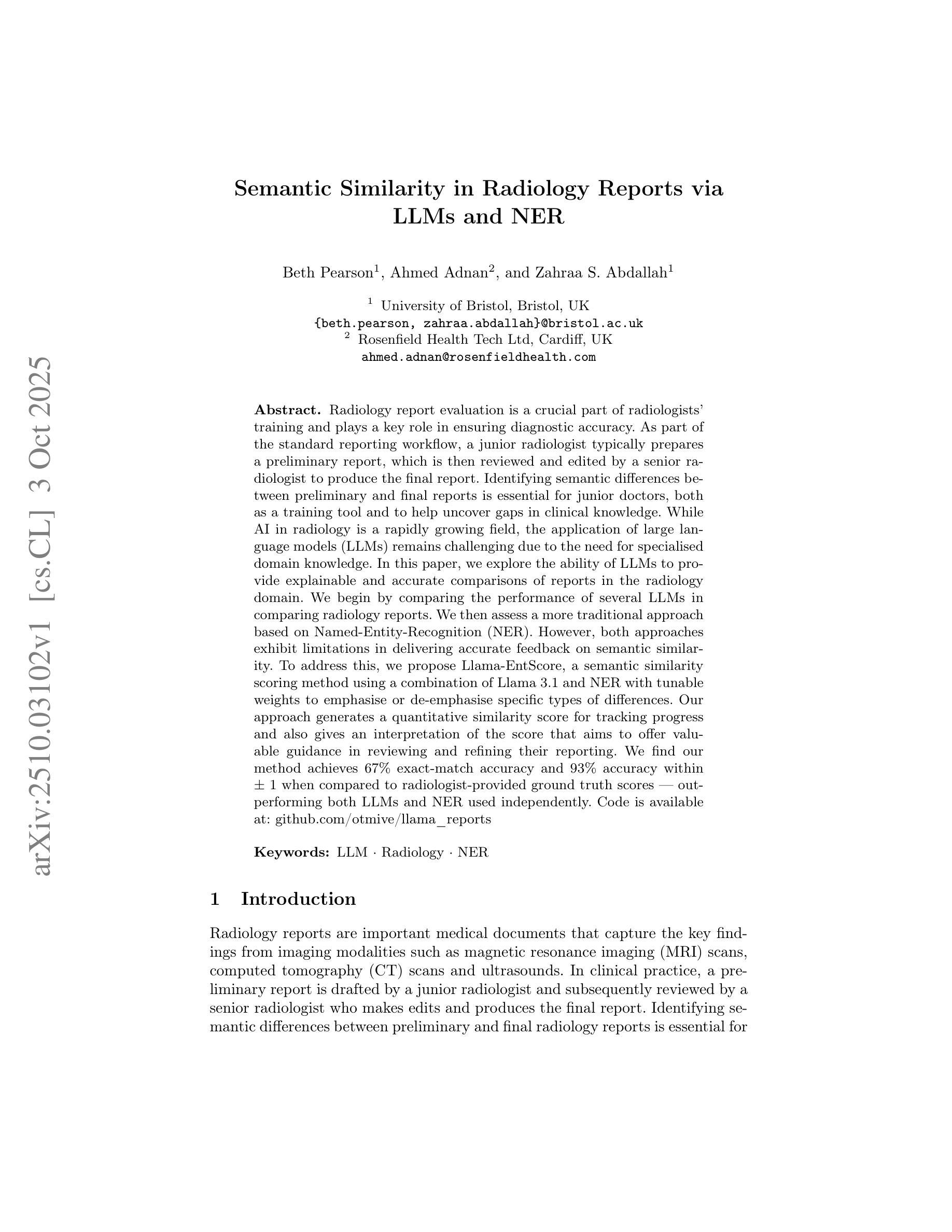 放射学报告评估是放射科医生培训的重要组成部分,对于确保诊断的准确性起着关键作用。作为标准报告工作流程的一部分,初级放射科医生通常会编写初步报告,然后由高级放射科医生进行审查和编辑以产生最终报告。识别初步报告和最终报告之间的语义差异对初级医生至关重要,既作为培训工具,也有助于发现临床知识方面的不足。尽管人工智能在放射学领域是一个快速发展的领域,但由于需要专业领域的知识,大型语言模型(LLM)的应用仍然具有挑战性。在本文中,我们探讨了LLM在放射学报告中提供可解释和准确比较的能力。我们首先比较了多个LLM在比较放射学报告方面的性能。然后我们评估了一种基于命名实体识别(NER)的更传统的方法。然而,这两种方法在提供语义相似性方面的准确反馈方面都表现出局限性。为了解决这一问题,我们提出了Llama-EntScore,一种使用Llama 3.1和NER组合的语义相似性评分方法,具有可调权重,可以强调或淡化特定类型的差异。我们的方法生成定量相似性分数以跟踪进度,并对分数进行解释,旨在为审查和改进报告提供有价值的指导。我们发现,与放射科医生提供的真实分数相比,我们的方法达到了67%的精确匹配准确率和93%的准确率(在+/- 1范围内)——超越了独立使用的LLM和NER。代码可在github.com/otmive/llama_reports获得。