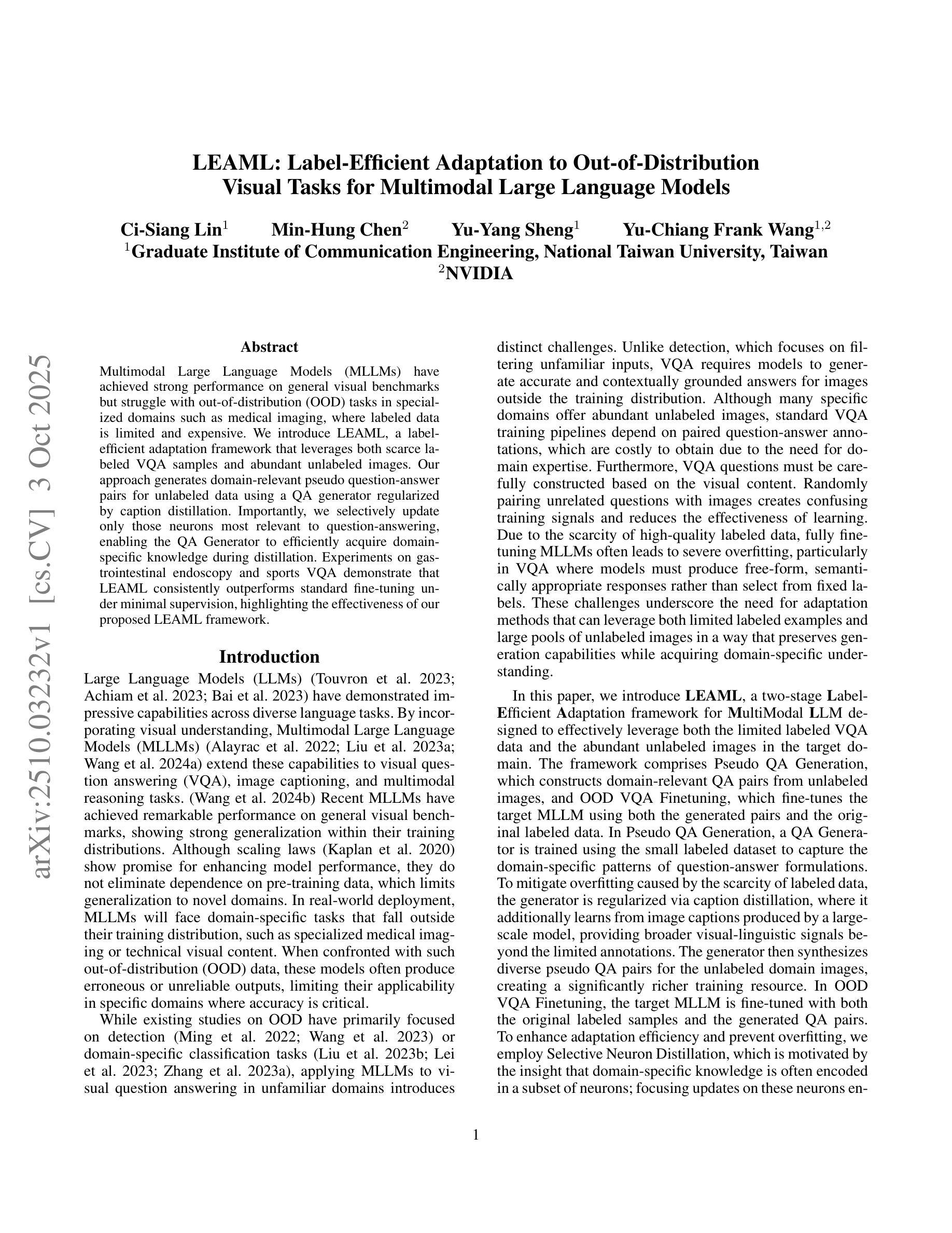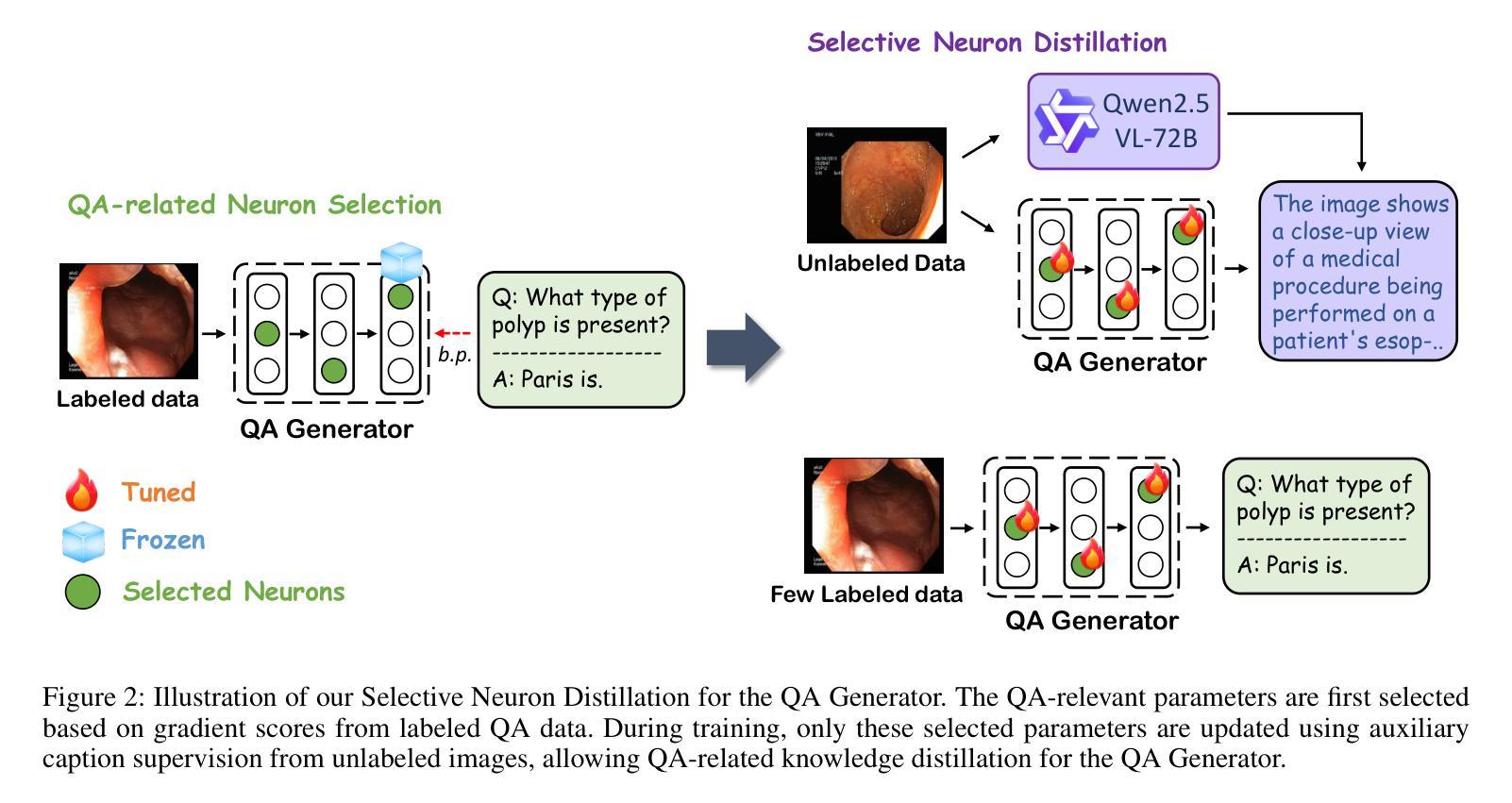 多模态大型语言模型(MLLMs)在通用视觉基准测试中取得了出色的表现,但在特定领域的非常规任务(如医学成像)中却表现挣扎,因为医学成像等领域的标注数据既有限又昂贵。我们引入了LEAML,这是一个标签高效适应框架,它充分利用了稀缺的标注VQA样本和大量的未标注图像。我们的方法使用通过标题蒸馏进行正则化的QA生成器,为未标注数据生成与领域相关的伪问答对。重要的是,我们只选择性地更新与问答最相关的神经元,使QA生成器在蒸馏过程中能够有效地获取特定领域的知识。在胃镜和体育问答方面的实验表明,在最小监督下,LEAML始终优于标准微调方法,突显了我们提出的LEAML框架的有效性。