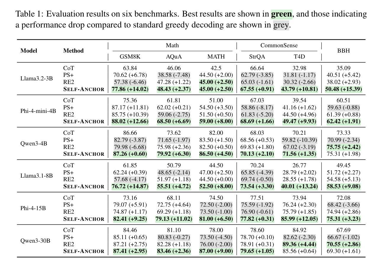 - Self-Anchor将推理轨迹分解为结构化计划,使模型能够更清晰地识别并关注关键推理步骤。