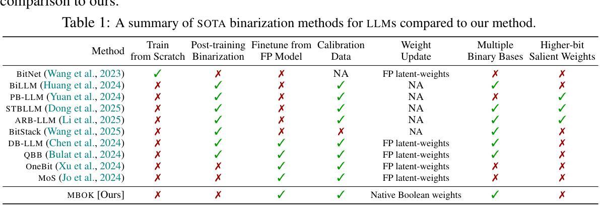 - 现有方法包括训练后的二值化,虽然简单但性能损失严重;以及依赖全精度潜在权重的训练感知方法,增加了复杂性和限制了效率。