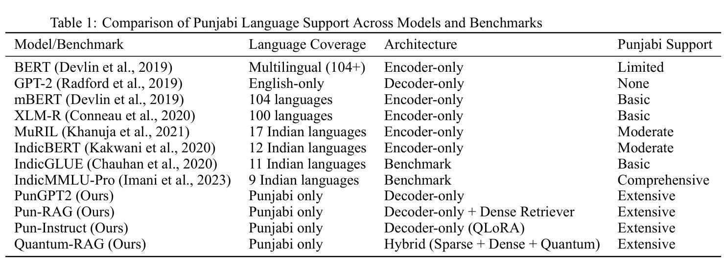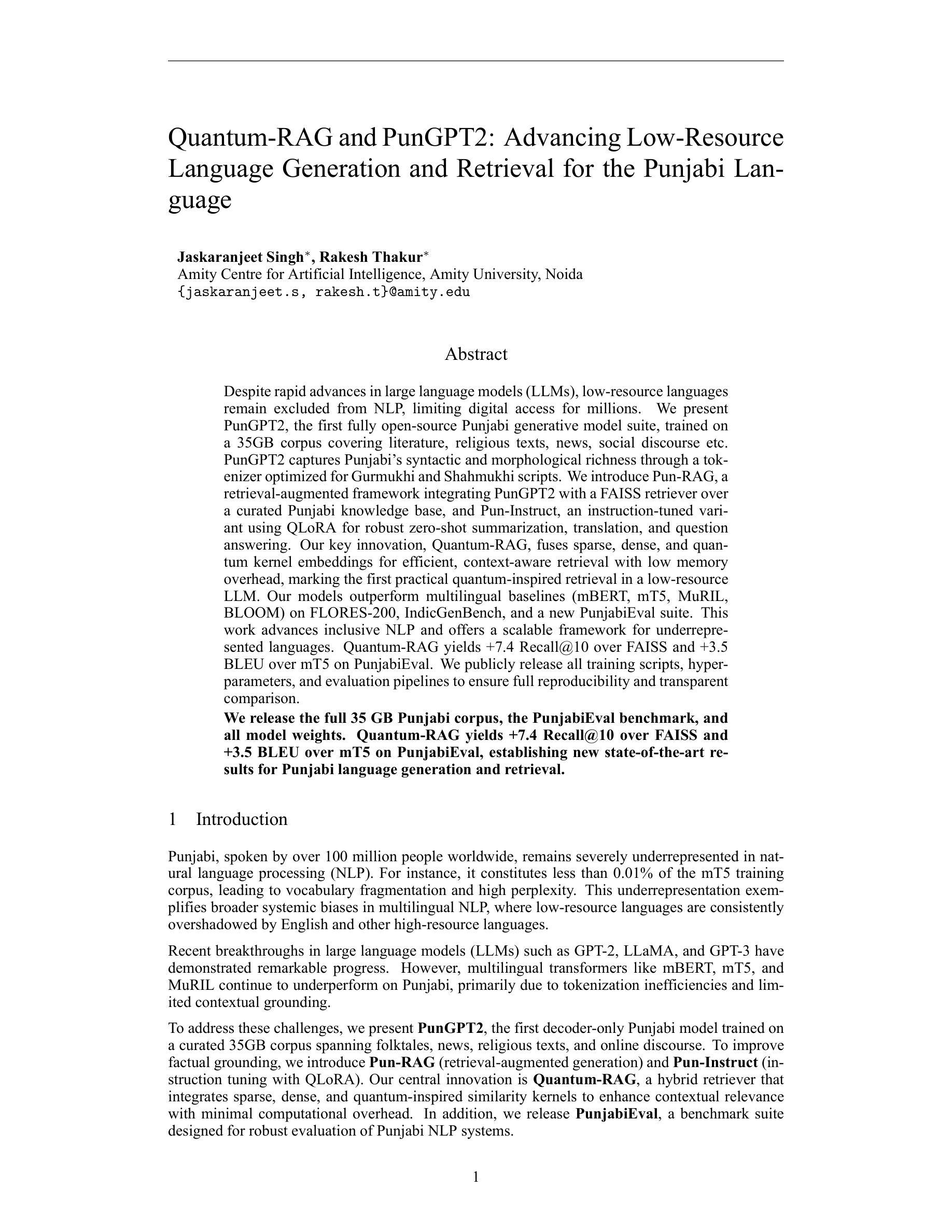 尽管大型语言模型(LLM)迅速进步,但低资源语言仍然被排除在NLP之外,限制了数百万人的数字访问。我们推出了PunGPT2,这是第一个完全开源的旁遮普语生成模型套件,它基于一个包含文献、宗教文本、新闻、社会话语等内容的35GB语料库进行训练。PunGPT2通过针对古尔姆基和沙姆基脚本优化的分词器捕捉旁遮普语的句法和形态丰富性。我们引入了Pun-RAG,这是一个结合了PunGPT2与针对精选旁遮普知识库的FAISS检索器的检索增强框架,以及Pun-Instruct,这是一个使用QLoRA进行稳健的零射击摘要、翻译和问答的指令调整变体。我们的关键创新是Quantum-RAG,它融合了稀疏、密集和量子核嵌入,用于实现具有低内存开销的高效、上下文感知检索,这是低资源LLM中首个实用的量子启发式检索。我们的模型在FLORES-200、IndicGenBench和新的PunjabiEval套件上的表现超过了多语言基线(mBERT、mT5、MuRIL、BLOOM)。Quantum-RAG在PunjabiEval上的Recall@10比FAISS高出7.4,BLEU比mT5高出3.5。我们公开发布所有的训练脚本、超参数、评估管道、35GB的旁遮普语料库、PunjabiEval基准测试以及所有的模型权重,为旁遮普语的语言生成和检索树立了新的最新成果。