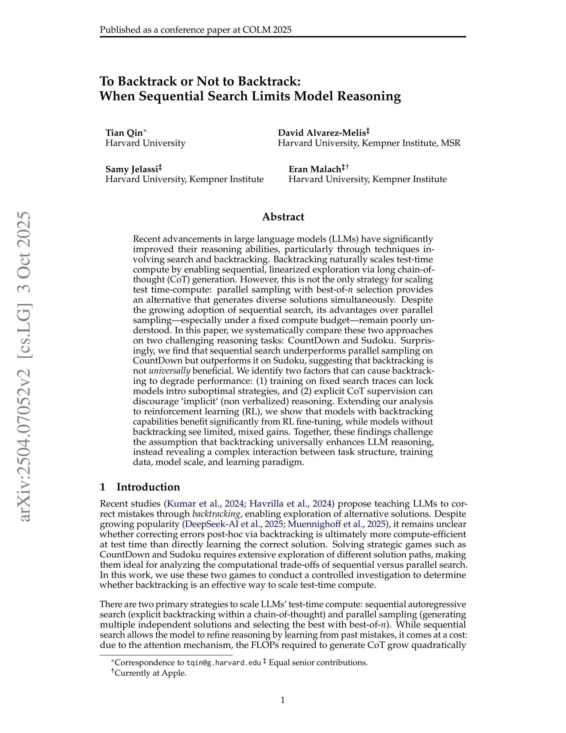 近期大型语言模型(LLM)的进步显著提高了其推理能力,特别是通过涉及搜索和回溯的技术。回溯通过启用序列化、线性化的探索(通过长链条思维生成),自然地扩展了测试时间的计算。然而,这并不是扩展测试时间计算的唯一策略:并行采样与最佳N选择相结合,可以同时生成多种解决方案。尽管序贯搜索的采用日益增加,但其相对于并行采样的优势,特别是在固定计算预算下,仍鲜为人知。在本文中,我们在两个具有挑战性的推理任务CountDown和数独上系统地比较了这两种方法。令人惊讶的是,我们发现序贯搜索在CountDown上的表现不如并行采样,但在数独上的表现优于并行采样,这表明回溯并非普遍有益。我们确定了可能导致回溯降低性能的两大因素:(1)在固定搜索轨迹上进行训练会使模型陷入次优策略;(2)明确的思维链监督可能会抑制隐含(未言语化)的推理。我们将分析扩展到强化学习(RL),发现具有回溯能力的模型从RL微调中受益匪浅,而没有回溯能力的模型则收效甚微。总体而言,这些发现挑战了回溯普遍提高LLM推理能力的假设,反而揭示了任务结构、训练数据、模型规模和学习范式之间的复杂交互。