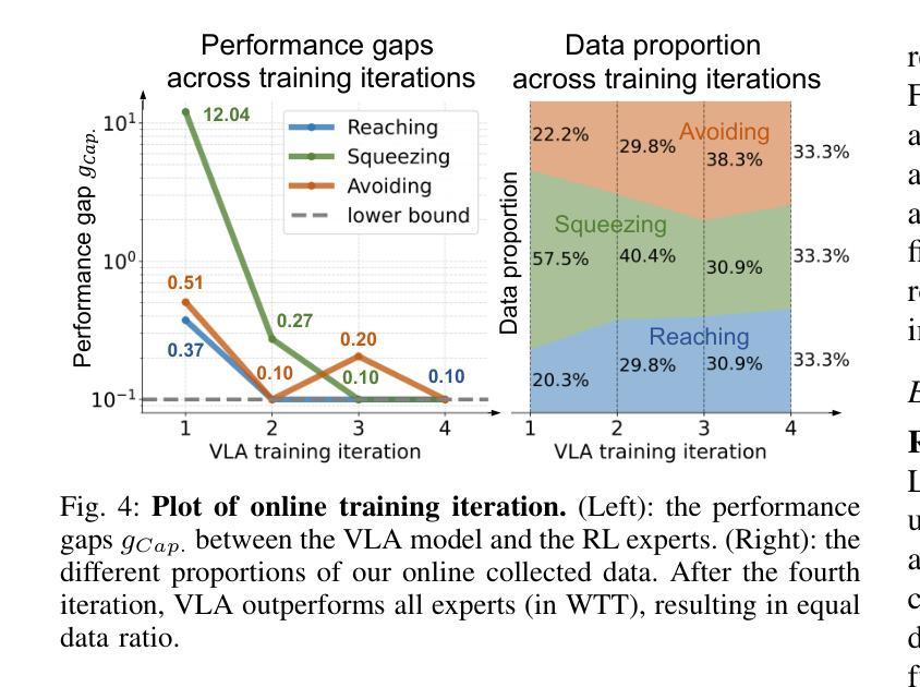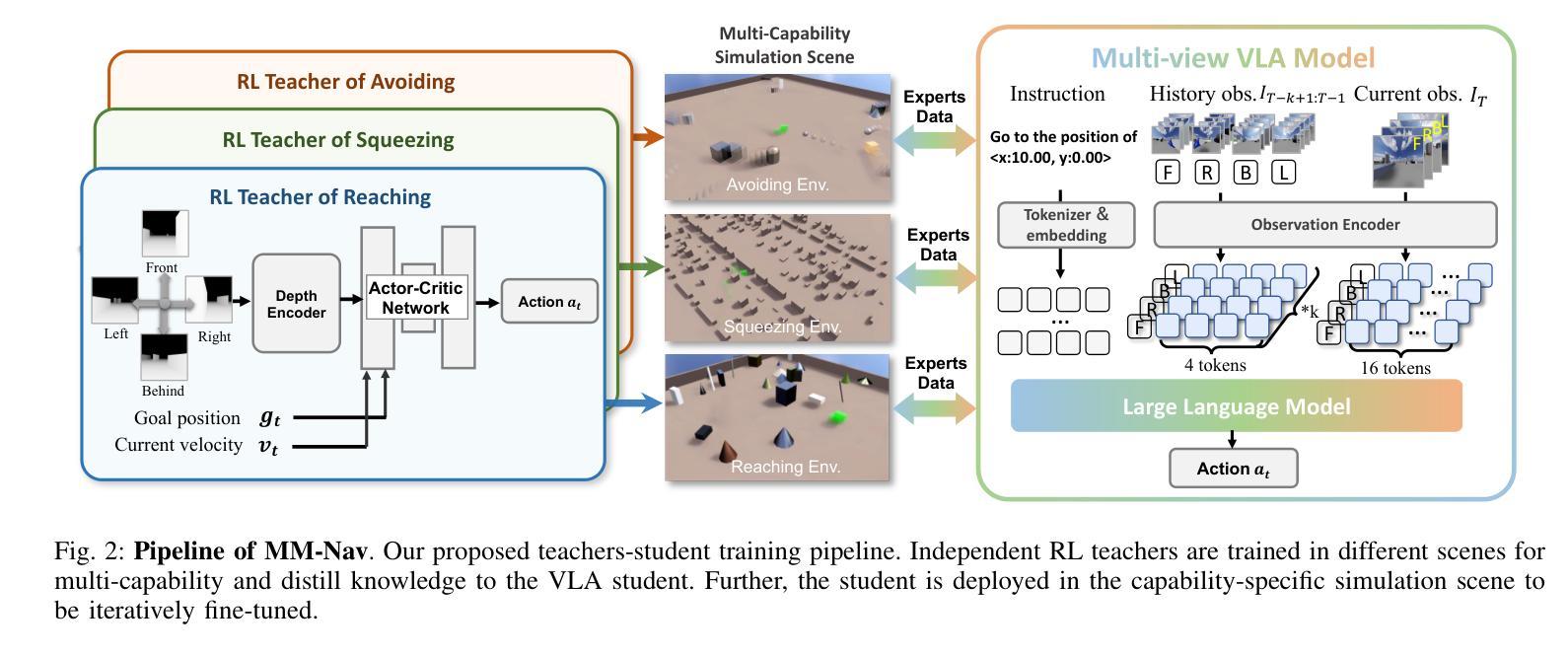 视觉导航策略被广泛认为是一个有前途的方向,因为它通过使用以自我为中心的观察来进行导航,从而模仿人类。然而,视觉观察的光学信息难以像激光雷达点云或深度图那样进行显式建模,这需要智能模型和大规模数据。为此,我们提出利用视觉语言行动(VLA)模型的智能,以师徒方式从合成专家数据中学习各种导航能力。我们实现了基于预训练的大型语言模型和视觉基础模型的MM-Nav多视图VLA模型(具有360度观察)。为了获取大规模导航数据,我们从三个强化学习专家收集的专家数据中收集数据,这些专家使用特权深度信息在三个针对不同导航能力的量身定制的环境中接受训练:到达、挤压和避免。我们迭代地训练我们的VLA模型,使用从强化学习专家在线收集的数据,其中训练比率是根据对个别能力的表现进行动态平衡的。在合成环境中的大量实验表明,我们的模型具有很强的泛化能力。此外,我们发现我们的学生VLA模型的表现优于强化学习老师,证明了整合多种能力的协同效应。在现实世界中的大量实验进一步证实了我们的方法的有效性。