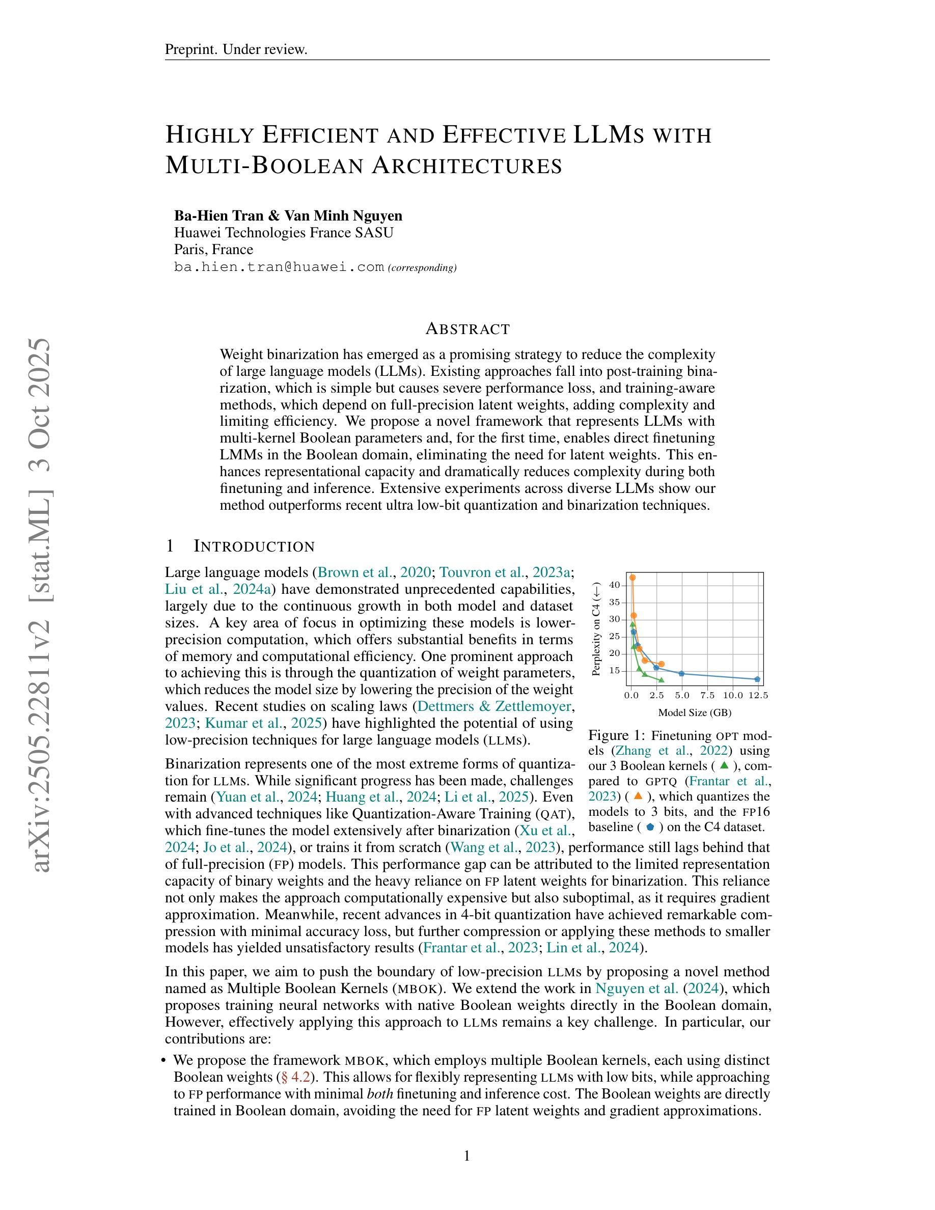 本文提出一种基于多核布尔参数表示的大型语言模型(LLM)新型框架,可直接在布尔域进行LLM微调,无需使用潜在权重,提高了表示能力,并大幅降低了微调与推理时的复杂度。此框架突破现有训练后二元化与训练感知方法的局限,实验证明其性能优于最近的超低精度量化与二元化技术。