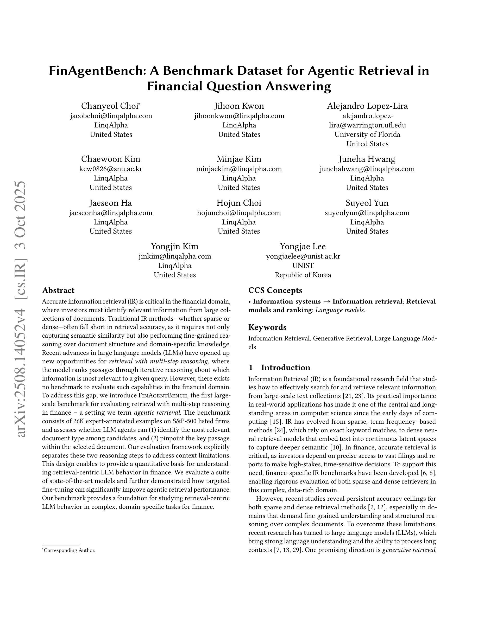 - 引入FinAgentBench作为首个针对金融领域的多步骤推理检索的基准测试。