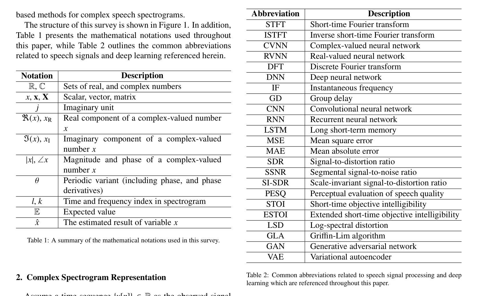 近期深度学习领域的进展对语音信号处理领域产生了重大影响,特别是在分析和处理复杂谱图方面。这篇综述全面概述了利用深度神经网络处理复杂谱图的最新技术。复杂谱图包含了幅度和相位信息。我们首先介绍复杂谱图及其用于各种语音处理任务的相关特征。接下来,我们研究复杂值神经网络的关键组件和架构,这些网络专门设计用于处理复数数据,并已应用于复杂谱图处理。由于近期研究主要集中在将实值神经网络应用于复杂谱图上,因此我们重新审视了这些方法及其架构设计。然后,我们讨论了针对训练神经网络处理复杂谱图的定制的各种训练策略和损失函数。这篇综述还深入探讨了关键应用,包括相位恢复、语音增强和说话人分离,其中深度学习通过利用复杂谱图或其衍生的特征表示取得了显著进展。此外,我们还研究了复杂谱图与生成模型的交集。这篇综述旨在成为语音信号处理、深度学习和相关领域的研究者和实践者的宝贵资源。