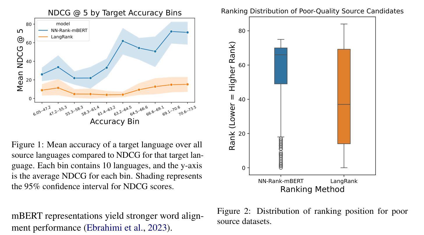 我们提出了NN-Rank算法,这是一种用于跨语言转移的源语言排名算法,它利用多语言模型的隐藏表示和未标记的目标语言数据。我们在两个预训练的多语言模型和两个任务上进行实验:词性标注(POS)和命名实体识别(NER)。我们考虑了51种源语言,并在POS和NER上分别对56种和72种目标语言进行评估。在使用领域数据时,NN-Rank击败了利用词汇和语言学特征的最新基线,平均改进了高达35.56的NDCG(对于POS)和18.14的NDCG(对于NER)。由于先前的方法在目标语言数据不可用时会回落到语言级特征,我们表明,仅使用《圣经》(一个可用于多种语言的领域外语料库)时,NN-Rank仍具有竞争力。关于未标记目标数据量的消融实验表明,对于仅包含25个例子的子集,NN-Rank能够产生高质量的排名,实现使用所有可用目标数据进行排名时的92.8%的NDCG。