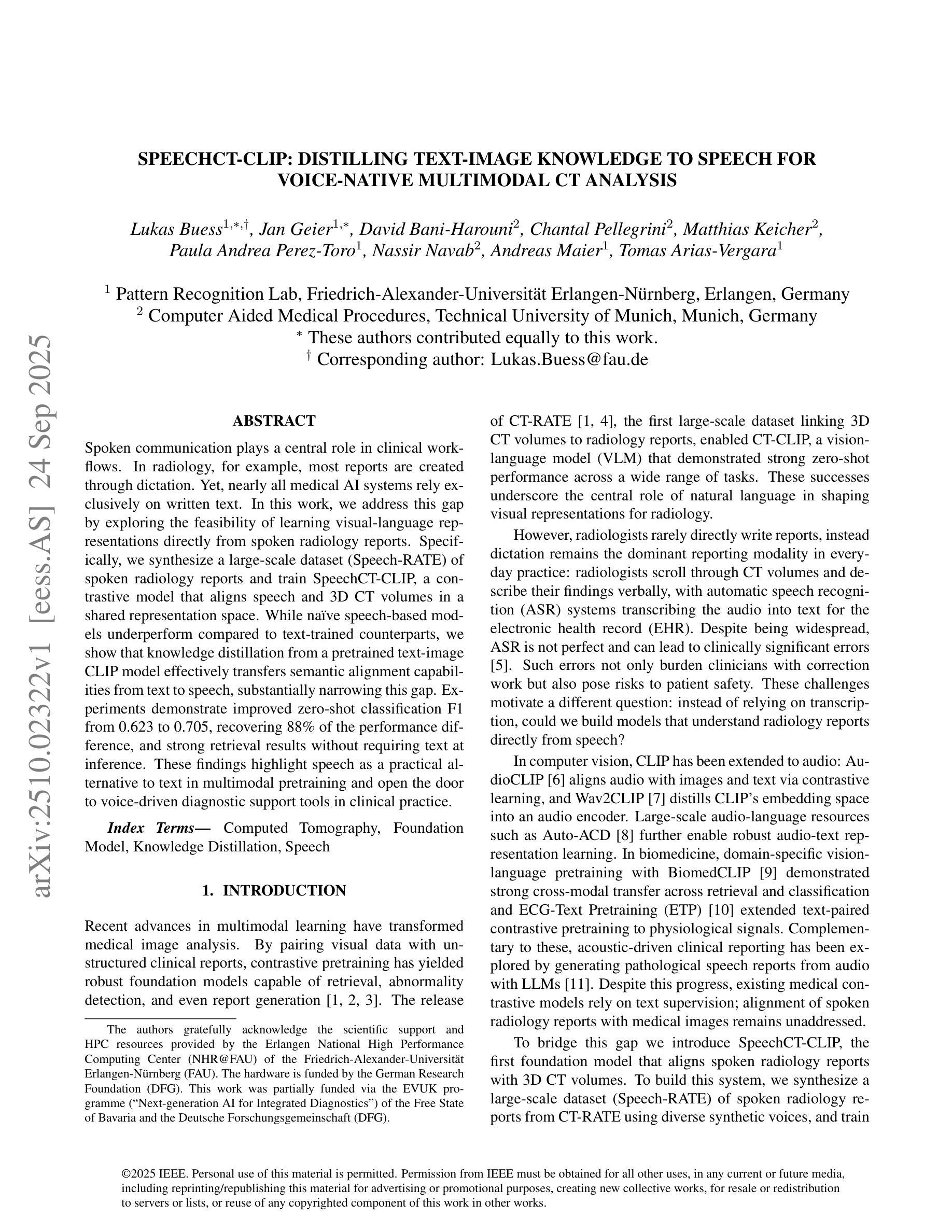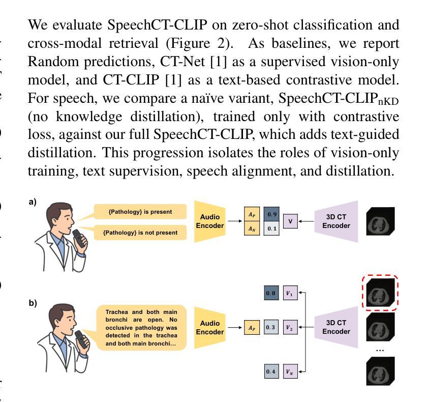 本文解决了医疗领域中口头报告与医疗AI系统之间的鸿沟问题。研究团队构建了一个大规模的口头报告数据集Speech-RATE,并开发了一个对比模型SpeechCT-CLIP,该模型将语音和3D CT体积在共享表示空间中对齐。尽管基于语音的模型在初始状态下表现不如文本训练的模型,但通过从预训练的文本图像CLIP模型进行知识蒸馏,成功将语义对齐能力从文本转移到语音,显著缩小了差距。实验表明,零样本分类的F1分数从0.623提高到0.705,恢复了88%的性能差异,并且无需文本推理即可实现强大的检索结果。这一发现强调了语音在跨模态预训练中的实用性,并为临床实践中使用语音驱动的辅助诊断工具打开了大门。