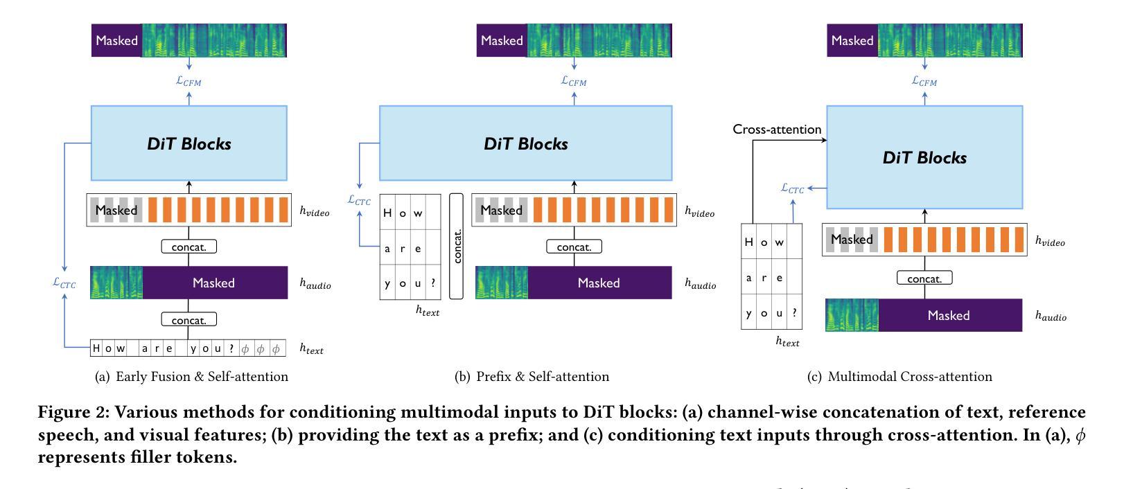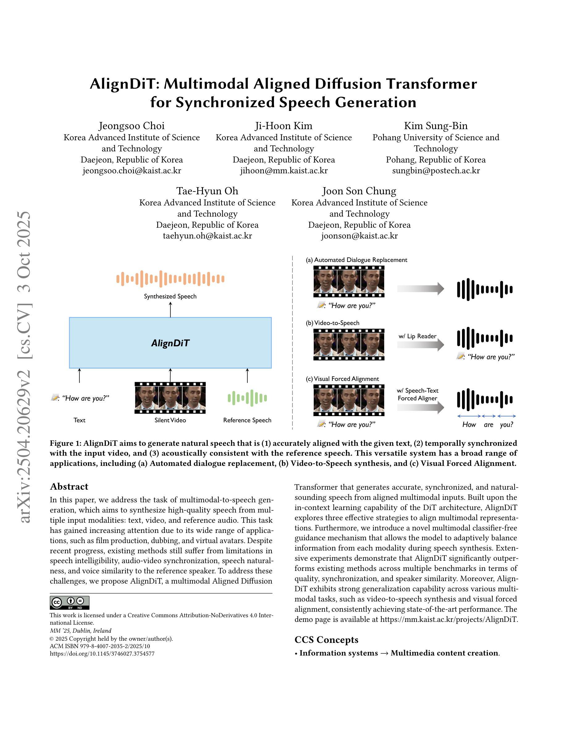 本文我们解决了多模态到语音生成的任务,该任务旨在从多种输入模式(文本、视频和参考音频)中合成高质量语音。由于该任务在影视制作、配音和虚拟角色等领域的广泛应用,它已受到越来越多的关注。尽管最近有进展,但现有方法仍面临语音清晰度、音视频同步、语音自然度和与参考说话人的声音相似性等方面的局限性。为了解决这些挑战,我们提出了AlignDiT,这是一种多模态对齐扩散Transformer,它可以从对齐的多模态输入中生成准确、同步和自然的声音。AlignDiT基于DiT架构的上下文学习能力,探索了三种有效的策略来进行多模态表示对齐。此外,我们引入了一种新的无分类器引导机制,使模型在语音合成过程中能够自适应地平衡各模态的信息。大量实验表明,AlignDiT在多个基准测试上的质量、同步和说话人相似性方面显著优于现有方法。而且,AlignDiT在各种多模态任务中表现出强大的泛化能力,如视频到语音的合成和视觉强制对齐,一直保持着最先进的表现。演示页面可访问:https://mm.kaist.ac.kr/projects/AlignDiT。