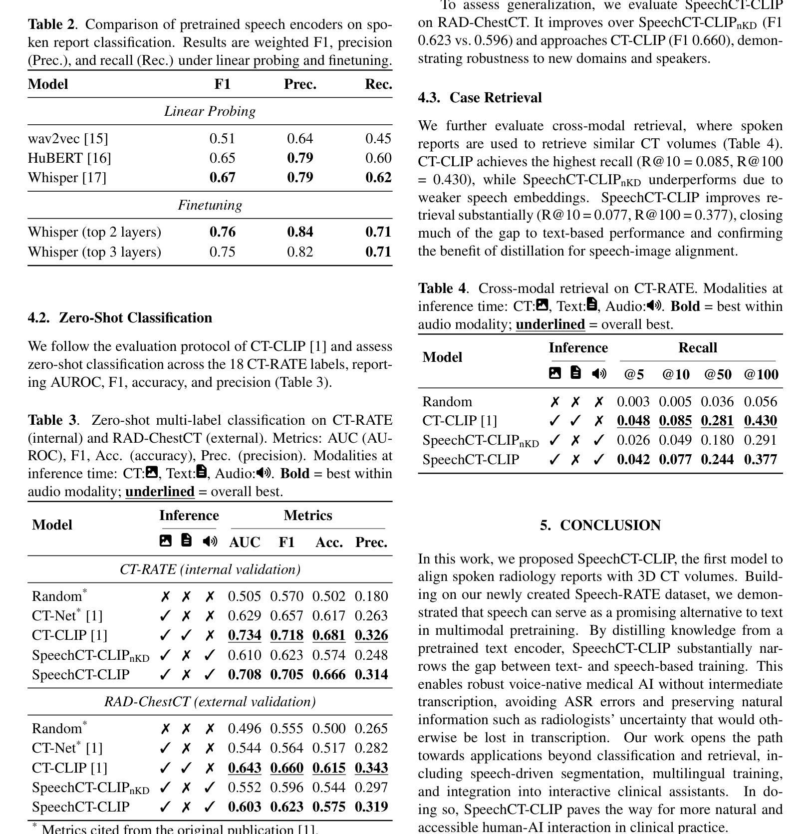 - 开发了一个对比模型SpeechCT-CLIP,能够将语音和3D CT体积在共享表示空间中对齐。
