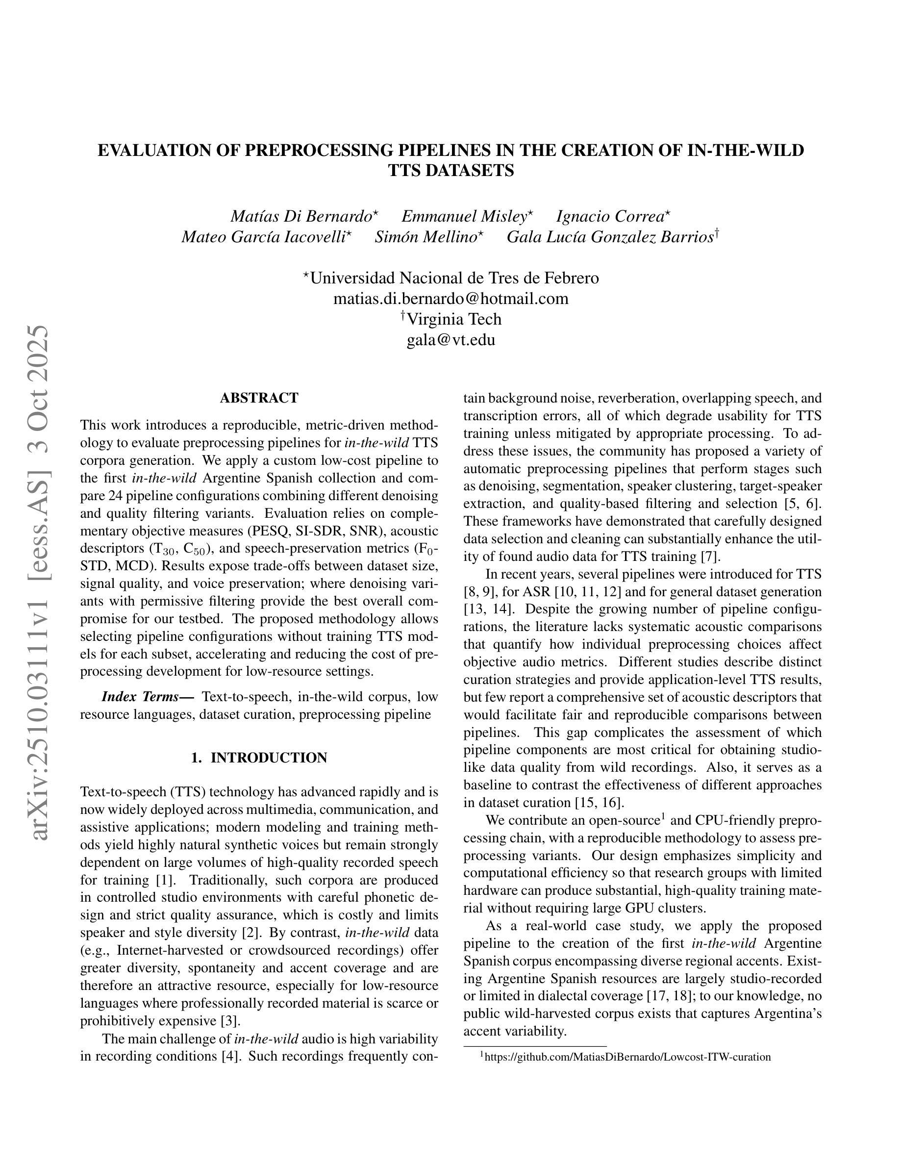 本文介绍了一种可复制的、以度量驱动的方法,用于评估用于野外TTS语料库生成的预处理管道。我们将自定义的低成本管道应用于第一个野外阿根廷西班牙收集集,并比较了结合不同降噪和质量过滤方案的24种管道配置。评估依赖于补充的客观度量(PESQ、SI-SDR、SNR)、声学描述符(T30、C50)和语音保存度量(F0-STD、MCD)。结果揭示了数据集大小、信号质量和语音保留之间的权衡;其中允许过滤的降噪变体为测试台提供了最佳的总体平衡。所提出的方法允许在选择管道配置时无需针对每个子集训练TTS模型,从而加快并降低低资源设置下预处理开发的成本。
