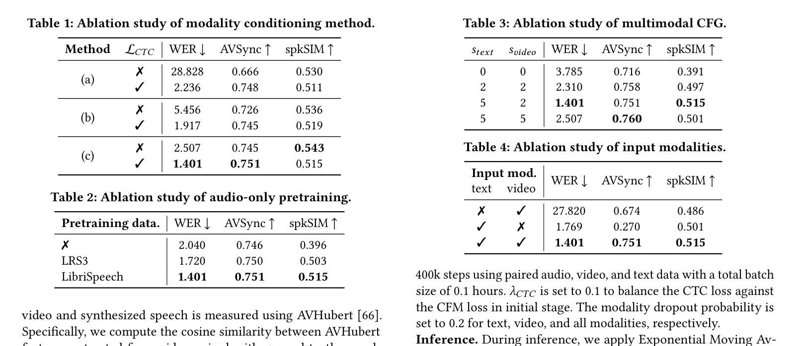- 引入的多模态无分类器引导机制使模型在语音合成时能自适应平衡各模态的信息。
