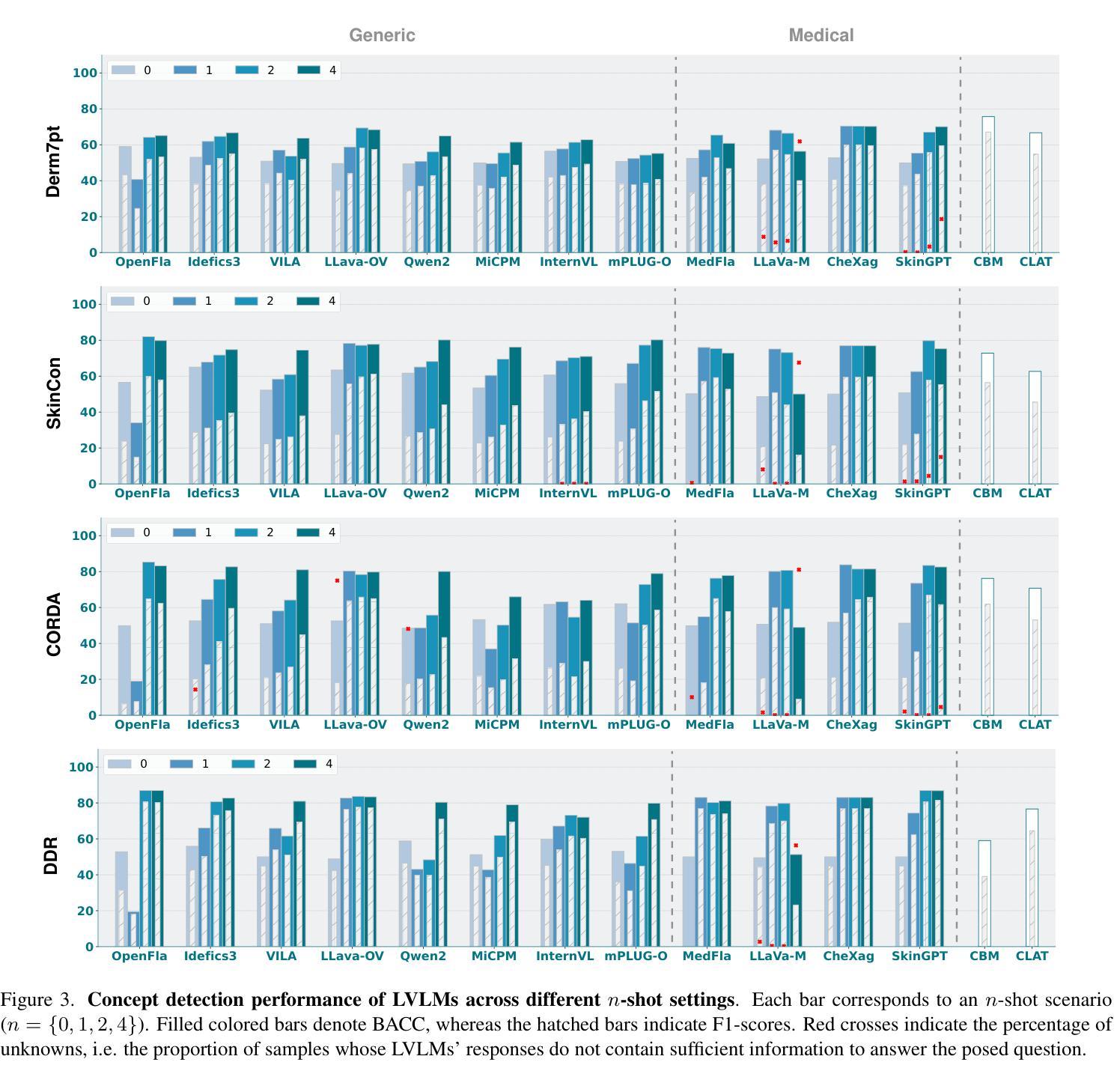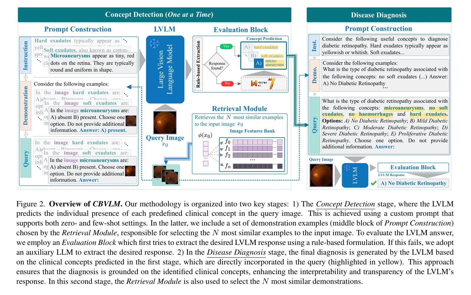 在医疗工作流中采用基于深度学习的解决方案的主要挑战在于标注数据的可用性和这些系统缺乏可解释性。概念瓶颈模型(CBM)通过限制模型输出在一组预先定义和可解释的概念上解决后者的问题。然而,通过基于概念的解释来提高可解释性意味着更高的标注负担。而且,如果要添加新概念,整个系统都需要重新训练。受大型视觉语言模型(LVLM)在少量样本环境中的出色性能启发,我们提出了一种简单而有效的方法,即CBVLM,它解决了上述两个挑战。首先,对于每个概念,我们提示LVLM回答概念是否存在于输入图像中。然后,我们让LVLM基于先前的概念预测对图像进行分类。而且,在这两个阶段中,我们融入了一个检索模块,负责选择最佳样本进行上下文学习。通过将最终诊断建立在预测的概念上,我们确保了可解释性,并通过利用LVLM的少量样本能力,我们大大降低了标注成本。我们通过四个医疗数据集和十二个(通用和医疗)LVLM的广泛实验验证了我们的方法,并表明CBVLM始终优于CBM和特定任务的有监督方法,而且无需任何训练,只需使用少量标注样本即可。更多关于我们项目页面的信息:https://cristianopatricio.github.io/CBVLM/。