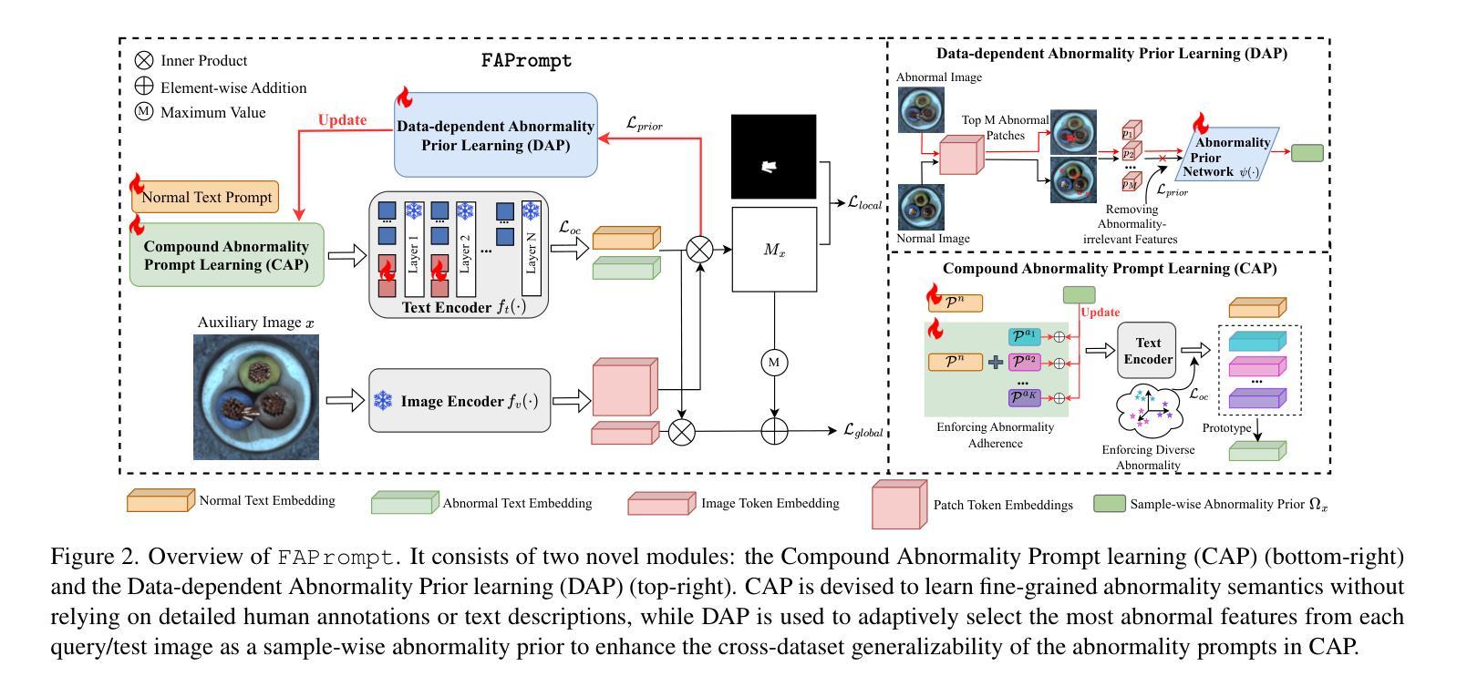 当前的无训练异常检测(Zero-Shot Anomaly Detection,ZSAD)方法在无需使用任何特定数据集的训练或演示的情况下,成功引导大型预训练视觉语言模型在目标数据集中检测异常。然而,这些方法通常侧重于设计/学习提示,这些提示只能捕捉到异常的粗粒度语义,例如“损坏”、“不完美”或“有缺陷”的对象的高级语义。因此,它们在识别以各种方式偏离这些一般异常模式的各种异常细节方面能力有限。为了解决这个问题,我们提出了FAPrompt,这是一个旨在学习精细异常提示的新型框架,以实现准确的ZSAD。为此,在FAPrompt中引入了一种新型复合异常提示学习(CAP)模块,用于学习一组互补的分解异常提示,其中异常提示被强制建模从相同正常语义派生的各种异常模式。另一方面,精细的异常模式可能因数据集而异。为了提高跨数据集的泛化能力,我们在FAPrompt中引入了另一种名为数据依赖异常先验学习(DAP)的新模块,该模块从每个测试图像中的异常特征中学习样本级的异常先验,以动态适应个别测试图像的异常提示。在涵盖工业缺陷和医学异常的19个真实数据集上的综合实验表明,FAPrompt在图像和像素级的ZSAD任务中均显著优于现有方法。代码可在https://github.com/mala-lab/FAPrompt找到。