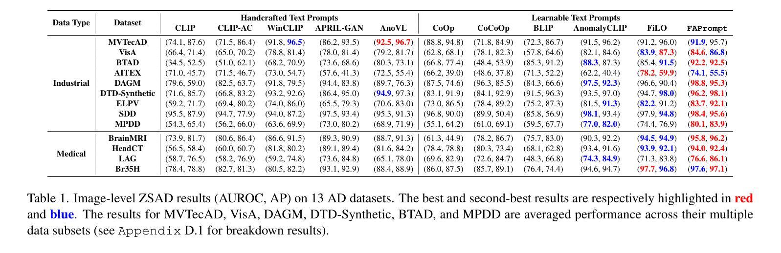 - 在多个真实世界数据集上的实验证明,FAPrompt在图像和像素级的ZSAD任务中表现优于其他方法。
