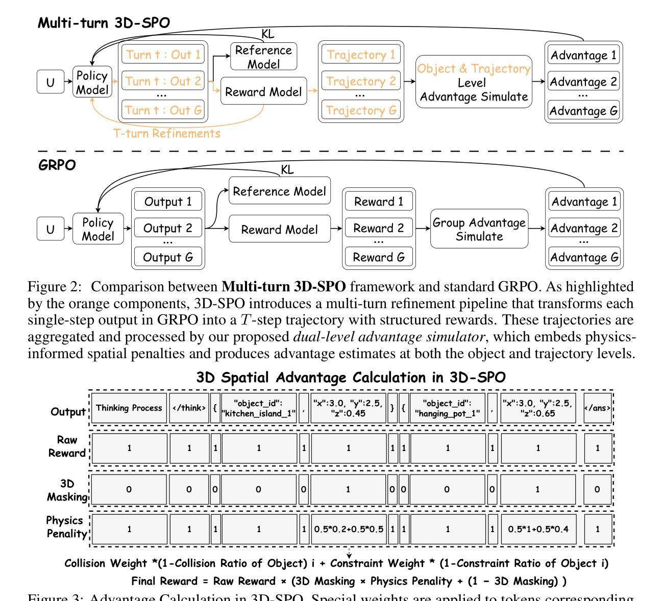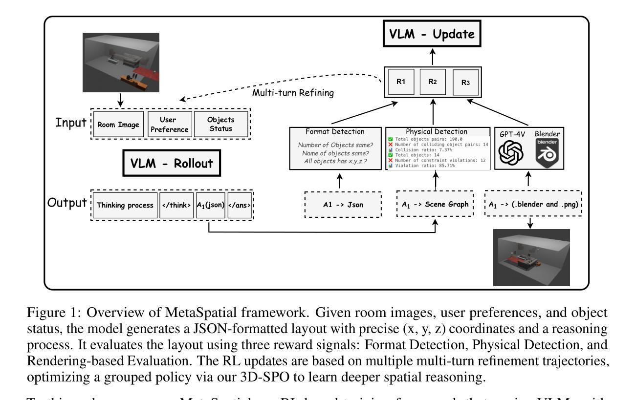 - MetaSpatial采用多轮RL优化机制,集成物理感知约束和渲染图像评估,确保生成的3D布局的连贯性、物理可行性和审美一致性。
