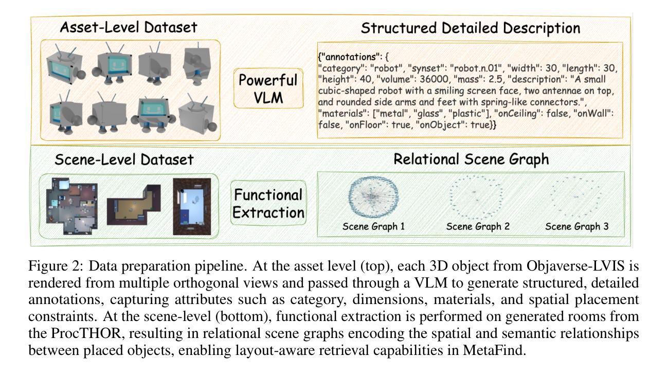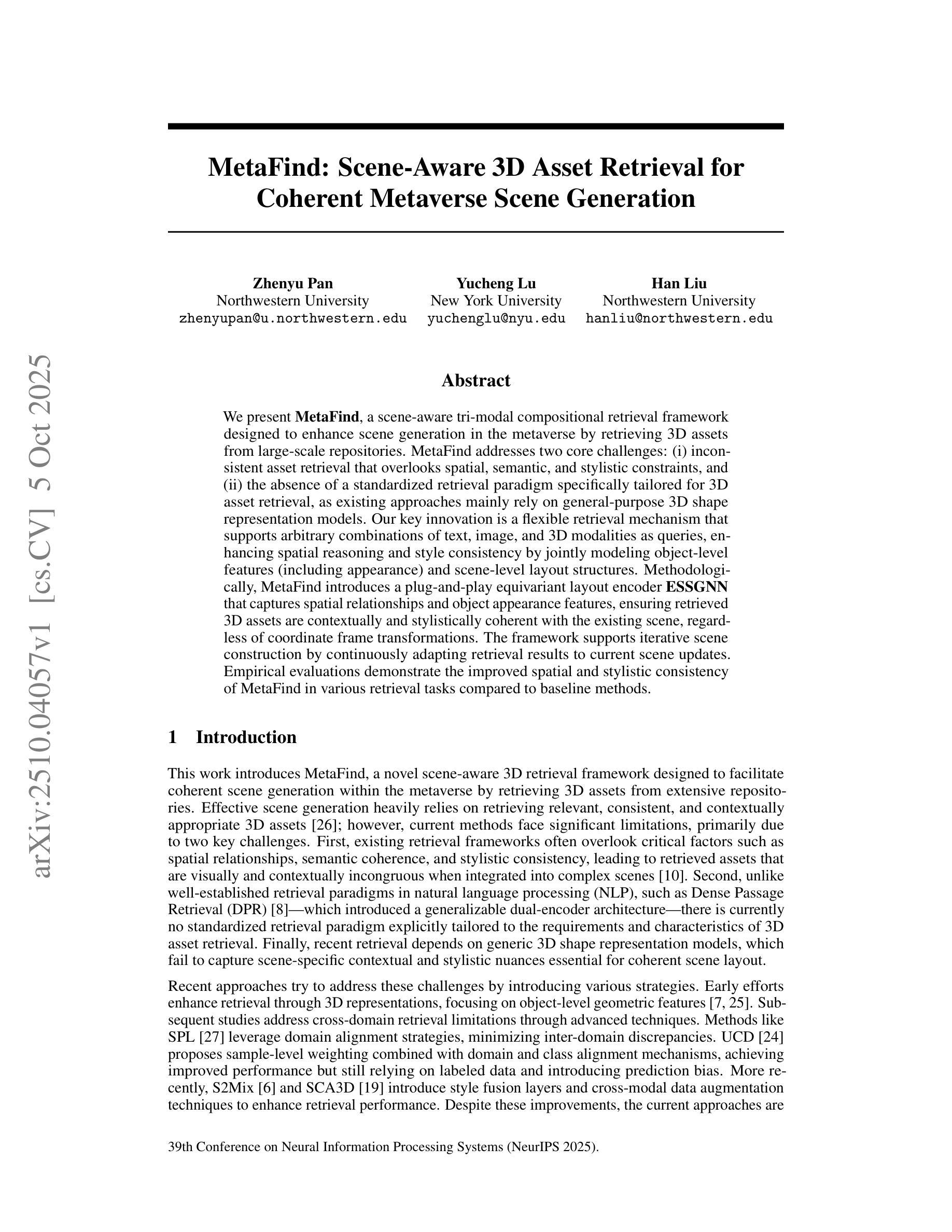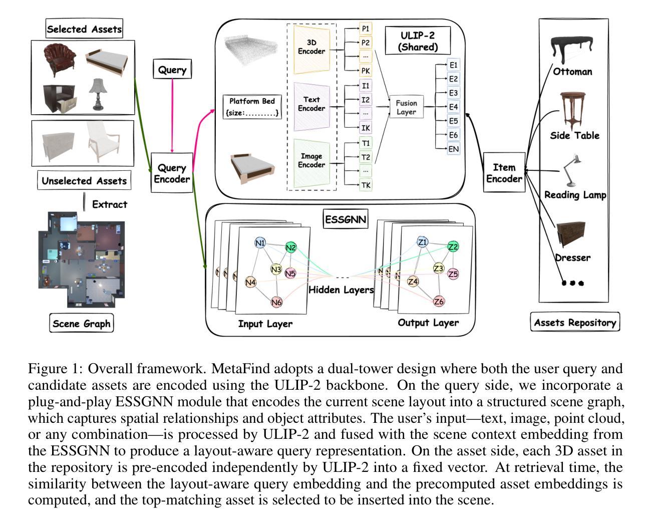 我们介绍了MetaFind,这是一个场景感知的三模态组合检索框架,旨在通过从大规模存储库中检索3D资产来增强元宇宙的场景生成。MetaFind解决了两个核心挑战:(i)资产检索的不一致性,忽视了空间、语义和风格约束;(ii)缺乏专门针对3D资产检索的标准检索范式,因为现有方法主要依赖于通用3D形状表示模型。我们的关键创新之处在于灵活的检索机制,它支持文本、图像和3D模式的任意组合作为查询,通过联合建模对象级特征(包括外观)和场景级布局结构,增强空间推理和风格一致性。方法上,MetaFind引入了一个即插即用的等变布局编码器ESSGNN,捕捉空间关系和对象外观特征,确保检索到的3D资产在上下文和风格上与现有场景一致,而无论坐标框架如何变换。该框架支持通过不断适应当前场景更新来进行迭代场景构建。经验评估表明,与基准方法相比,MetaFind在各种检索任务中提高了空间和风格的一致性。