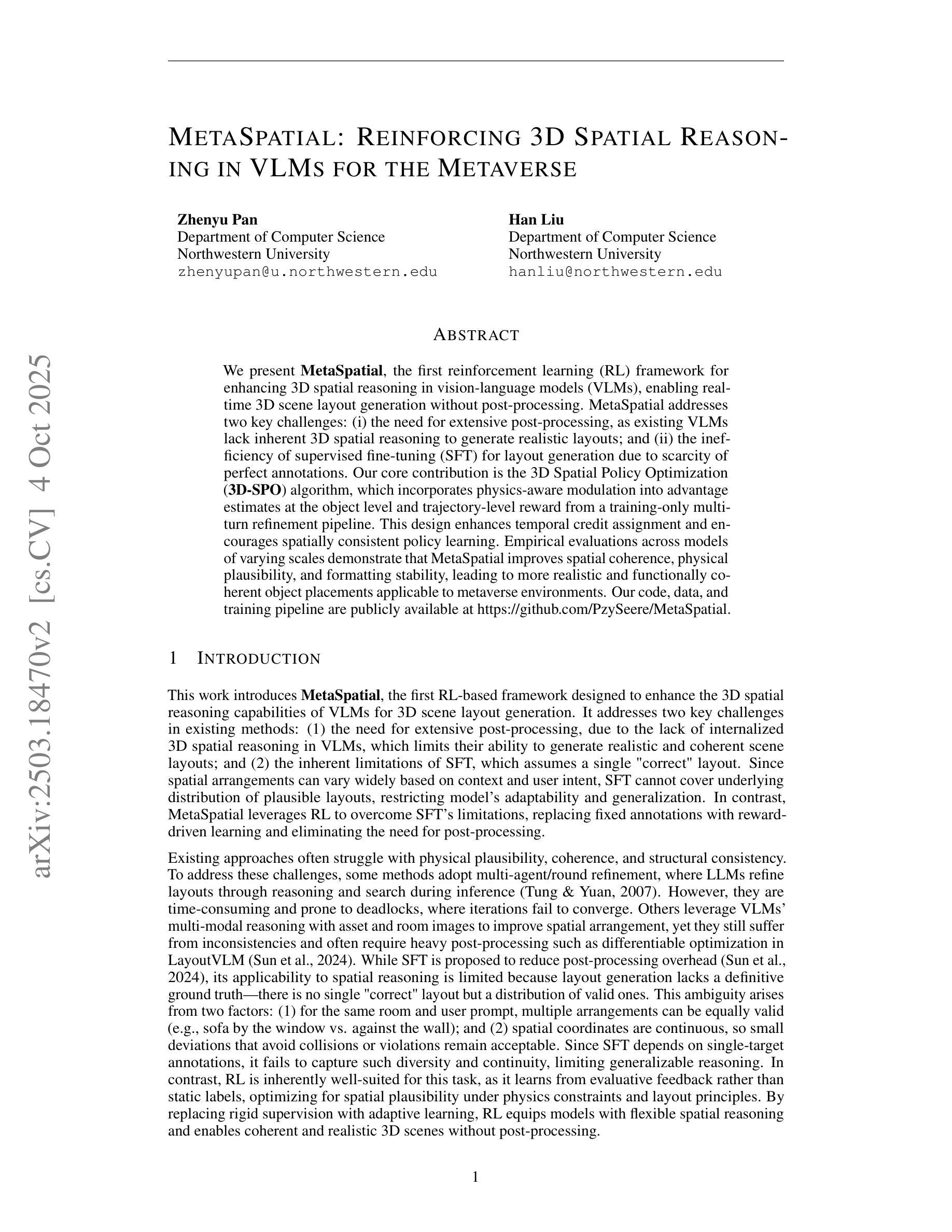MetaSpatial是一个基于强化学习(RL)的框架,旨在增强视觉语言模型(VLMs)的3D空间推理能力,实现实时3D场景生成而无需硬编码优化。该框架解决了两个核心挑战:一是VLMs缺乏内在化的3D空间推理能力,限制了其生成真实布局的能力;二是传统监督微调(SFT)在布局生成任务中的效率不高,因为完美的真实标注不可用。MetaSpatial的关键创新在于采用了一种多轮RL优化机制,该机制集成了物理感知约束和渲染图像评估,确保生成的3D布局具有连贯性、物理可行性和审美一致性。经验评估表明,MetaSpatial显著提高了各种规模模型的空间一致性和格式稳定性。训练后,对象放置更加真实、对齐和功能连贯,验证了强化学习在元宇宙、AR/VR、数字孪生和游戏开发应用中的3D空间推理的有效性。