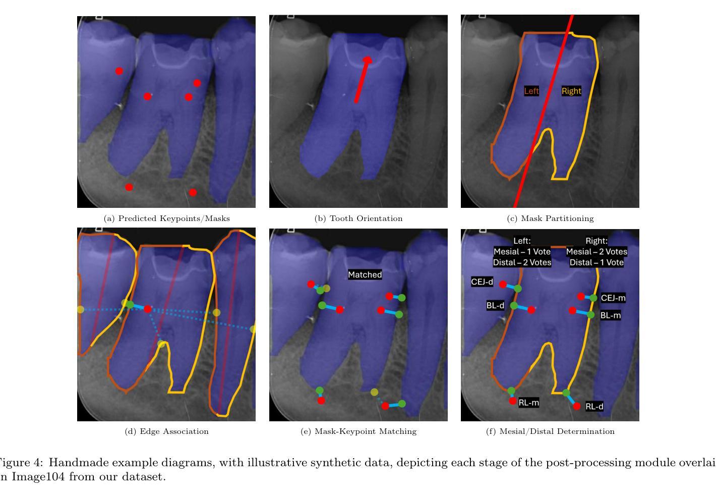 本研究提出了一种深度学习框架和标注方法,用于自动检测牙周骨丢失地标、相关疾病和分期。我们收集了192张根尖放射影像,采用一种与阶段无关的标注方法,对临床上相关的地标进行标注,无论疾病是否存在或程度如何。我们提出了一种启发式后处理模块,利用辅助实例分割模型将预测的关键点与牙齿边界对齐。还提出了一种评估指标——相对正确关键点百分比(PRCK),以捕捉牙齿成像领域中关键点的性能。四个捐赠者的姿势估计模型经过微调,以适应我们的关键点问题。后处理提高了精细定位的性能,使平均PRCK0.05提高0.028,但降低了粗略性能,PRCK0.25下降0.0523,PRCK0.5下降0.0345。方向估计在通过第1阶段目标检测模型过滤时表现出良好的性能,可用于辅助分割。牙周分期检测足够充分,最佳近中(mesial)和远中(distal)Dice得分分别为0.508和0.489,而分叉(furcation)参与度和增宽的牙周韧带空间任务仍具有挑战性,因为阳性样本稀少。相似验证集和外部集的性能暗示了可扩展性。标注方法能够实现与阶段无关的训练,在不同疾病严重程度之间实现均衡表示,用于某些检测任务。PRCK指标为领域特定的姿势指标提供了替代方案,而启发式后处理模块可以一致地纠正不可信的预测,尽管偶尔会出现灾难性故障。所提出的框架证明了临床上可解释的牙周骨丢失评估的可行性,具有减少诊断变异性和减轻临床医生工作量的潜力。
