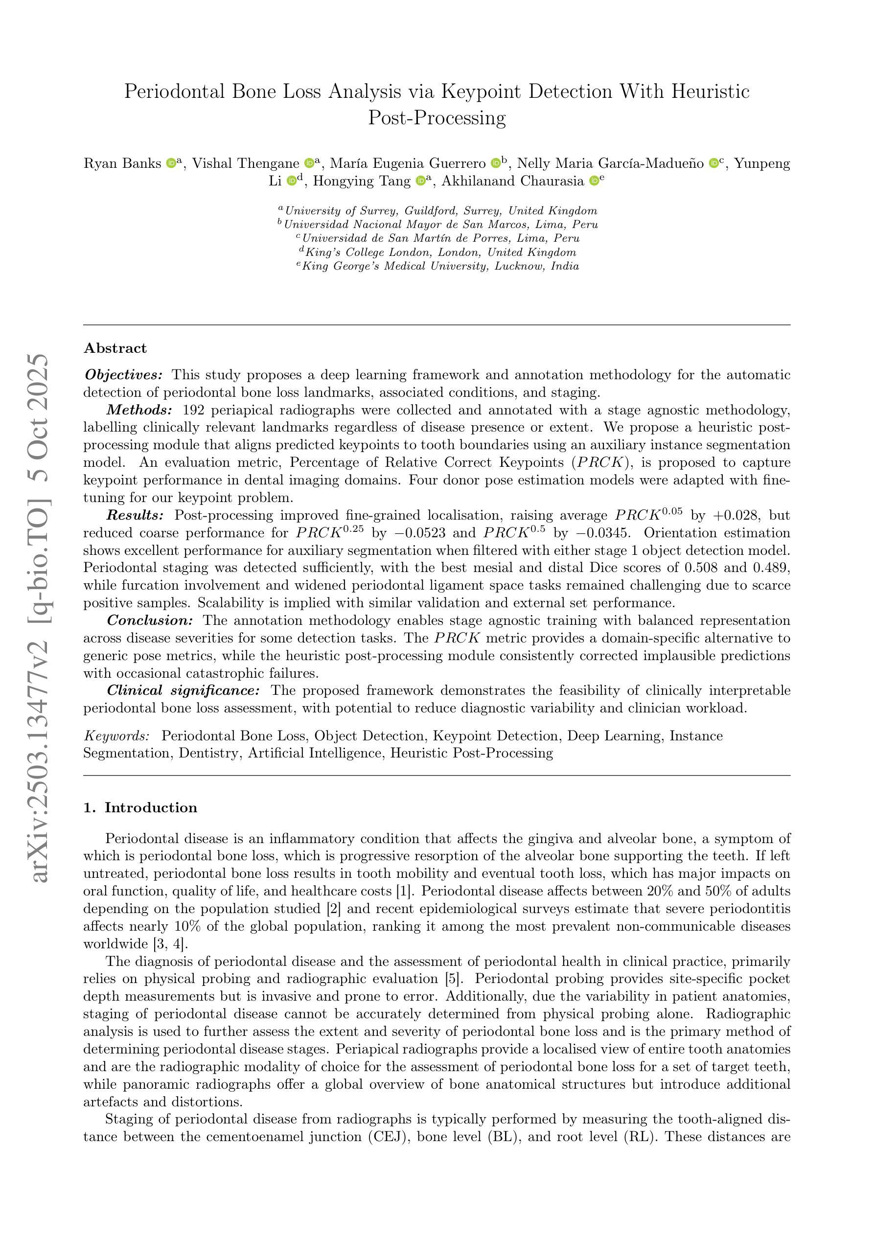 - 研究提出一种深度学习框架用于自动检测牙周骨丢失地标及相关疾病分期。