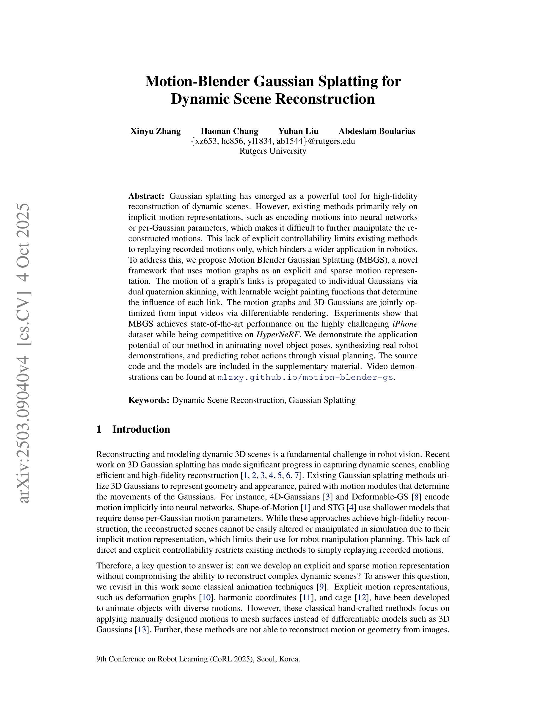 Gaussian splatting has emerged as a powerful tool for high-fidelity reconstruction of dynamic scenes. However, existing methods primarily rely on implicit motion representations, such as encoding motions into neural networks or per-Gaussian parameters, which makes it difficult to further manipulate the reconstructed motions. This lack of explicit controllability limits existing methods to replaying recorded motions only, which hinders a wider application in robotics. To address this, we propose Motion Blender Gaussian Splatting (MBGS), a novel framework that uses motion graphs as an explicit and sparse motion representation. The motion of a graph’s links is propagated to individual Gaussians via dual quaternion skinning, with learnable weight painting functions that determine the influence of each link. The motion graphs and 3D Gaussians are jointly optimized from input videos via differentiable rendering. Experiments show that MBGS achieves state-of-the-art performance on the highly challenging iPhone dataset while being competitive on HyperNeRF. We demonstrate the application potential of our method in animating novel object poses, synthesizing real robot demonstrations, and predicting robot actions through visual planning. The source code, models, video demonstrations can be found at http://mlzxy.github.io/motion-blender-gs.
