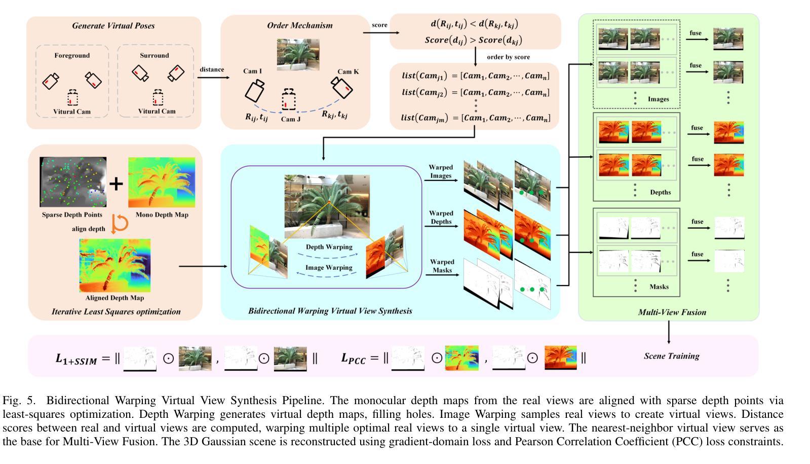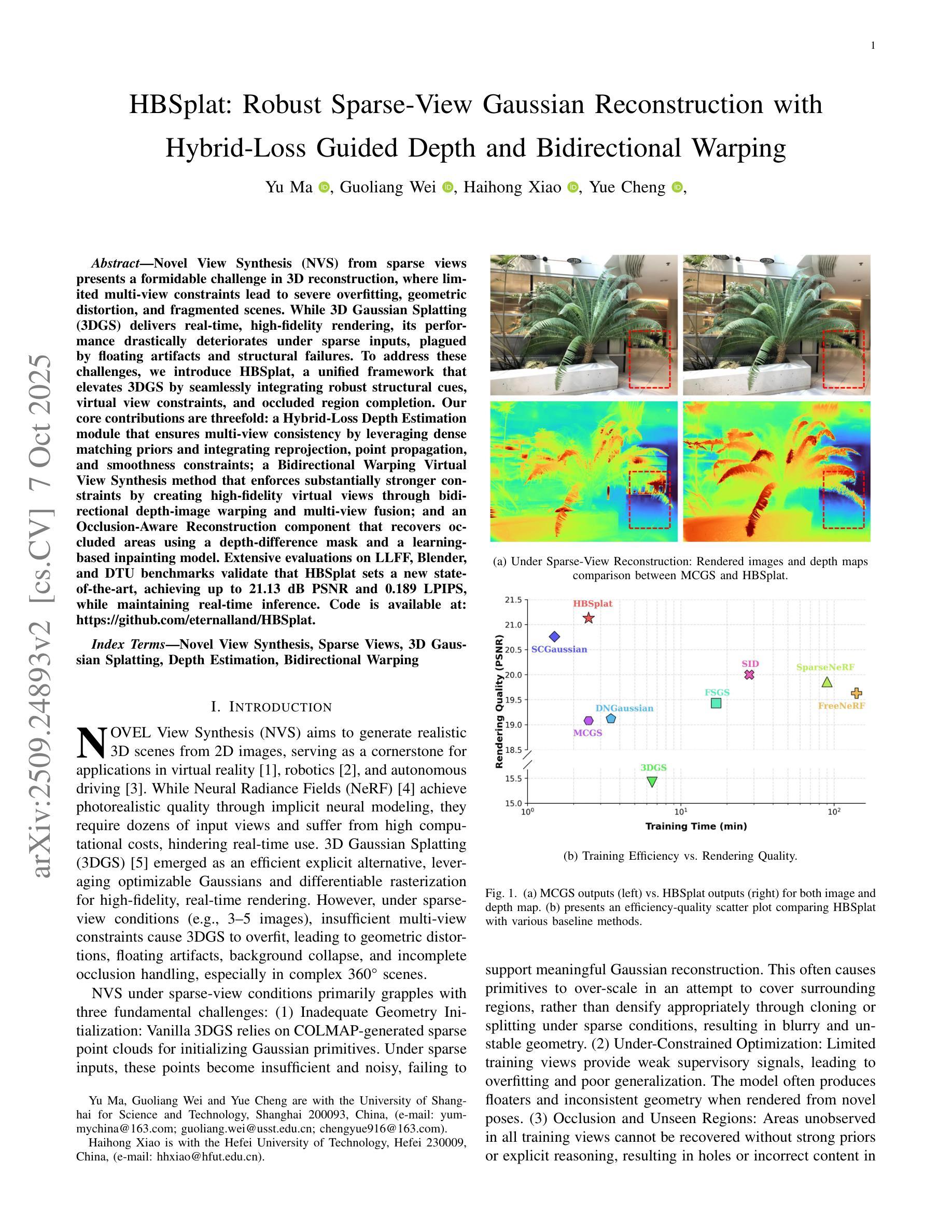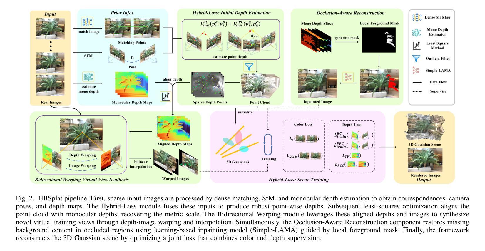 在3D重建中,从稀疏视角进行Novel View Synthesis(NVS)是一项巨大的挑战。有限的多视角约束会导致严重的过度拟合、几何失真和场景碎片化。虽然3D Gaussian Splatting(3DGS)可以实现实时、高保真渲染,但在稀疏输入的情况下,其性能会急剧下降,受到浮动伪影和结构失败的困扰。为了解决这些挑战,我们引入了HBSplat这一统一框架,它通过无缝集成稳健的结构线索、虚拟视图约束和遮挡区域完成来提升3DGS。我们的核心贡献有三点:一是Hybrid-Loss深度估计模块,它通过利用密集匹配先验知识并整合再投影、点传播和平滑约束来确保多视角一致性;二是双向扭曲虚拟视图合成方法,它通过双向深度图像扭曲和多视角融合来创建高保真虚拟视图,从而实施更严格的约束;三是遮挡感知重建组件,它使用深度差异掩膜和基于学习的修复模型来恢复遮挡区域。在LLFF、Blender和DTU基准测试上的广泛评估证明,HBSplat达到了最新技术水准,实现了高达21.13 dB的PSNR和0.189的LPIPS指标,同时保持实时推理。相关代码可访问:https://github.com/eternalland/HBSplat。