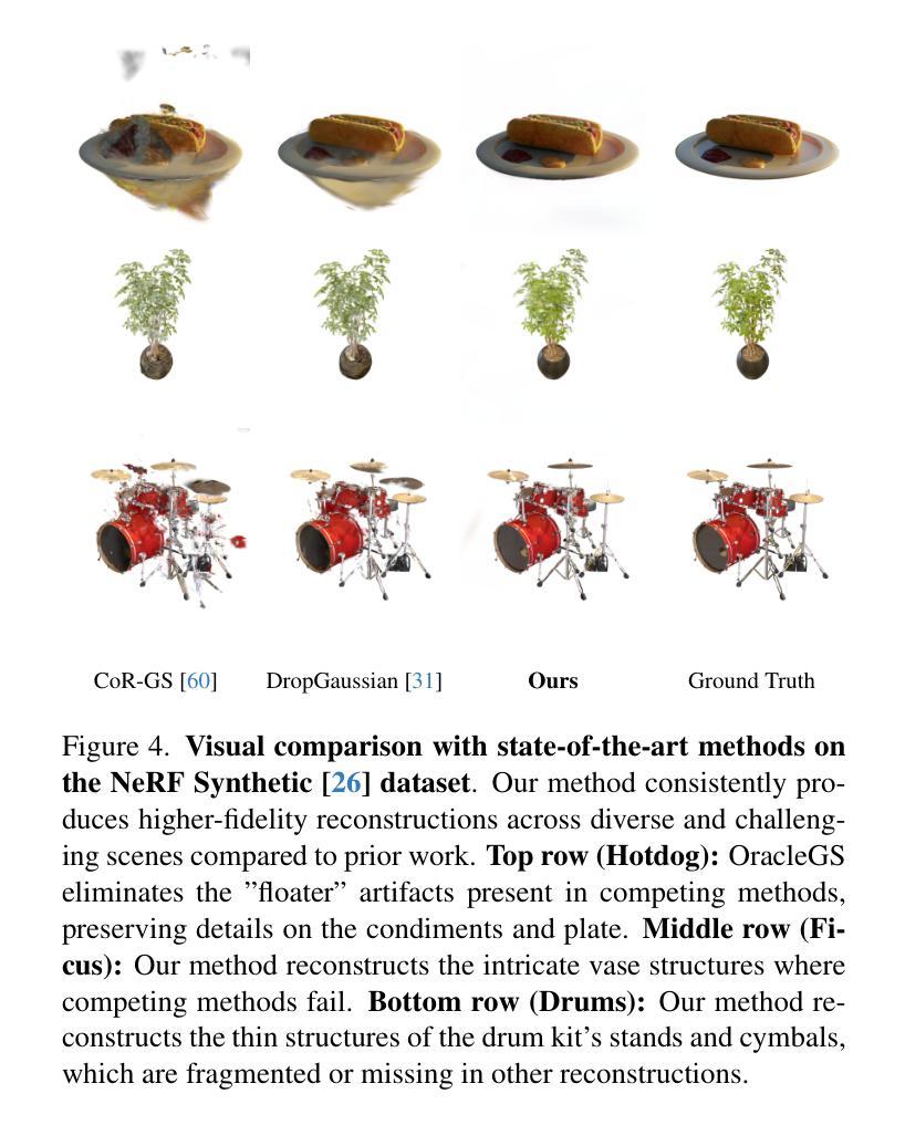 稀疏视角下的新型视图合成因严重的几何模糊性而本质上是不适定的。当前的方法陷入了权衡之中:回归模型在几何上忠实但不完整,而生成模型可以完成场景但经常引入结构不一致性。我们提出了OracleGS,这是一个新的框架,旨在调和生成模型的完整性与回归模型的忠实性,用于稀疏视角的高斯拼贴。我们并不使用生成模型来修复不完整的重建,而是采用“提出并验证”的框架。首先,我们利用预训练的3D感知扩散模型合成新型视图来提出一个完整的场景。然后,我们将多视角立体(MVS)模型重新用作一个3D感知的“专家”,以验证生成视图的3D不确定性,并使用其注意力图来揭示生成视图在多视角证据支持良好的区域,以及因遮挡、缺乏纹理或直接不一致而陷入高度不确定性的区域。这种不确定性信号直接指导了通过不确定性加权损失对3D高斯拼贴模型的优化。我们的方法以多视角几何证据为条件,对生成模型进行强大的先验约束,过滤掉幻觉伪影,同时在约束不足的区域内保留合理的完成度,在包括Mip-NeRF 360和NeRF Synthetic在内的数据集上的表现优于当前的主流方法。