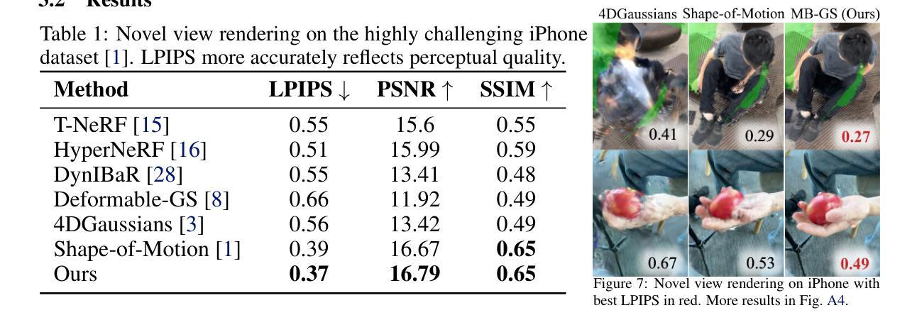 - MBGS在iPhone数据集上表现先进,同时在HyperNeRF上具有很强的竞争力。