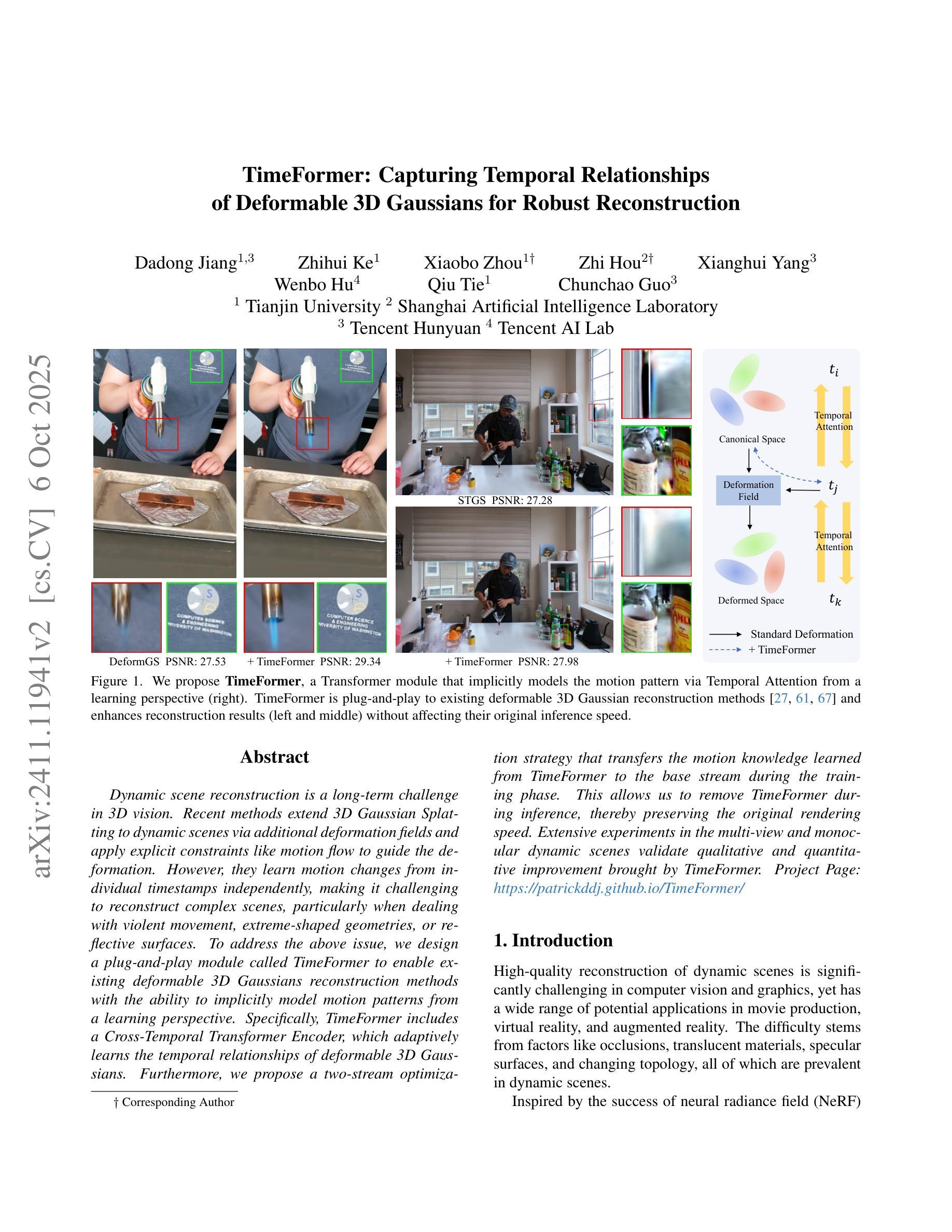 动态场景重建是3D视觉领域的一个长期挑战。针对现有方法在复杂动态场景重建中的不足,如无法处理剧烈运动、极端形状几何或反射表面等,本文设计了一个名为TimeFormer的即插即用模块。该模块能增强现有可变形3D高斯重建方法的能力,使其能够隐式地从学习角度对运动模式进行建模。TimeFormer包括一个跨时间Transformer编码器,可自适应地学习可变形3D高斯值的临时关系。此外,还提出了一个两流优化策略,将在训练阶段从TimeFormer中学到的运动知识转移到基础流中。在推理阶段,可移除TimeFormer,从而保持原始渲染速度。通过多视角和单目动态场景的广泛实验验证了TimeFormer带来的定性和定量改进。