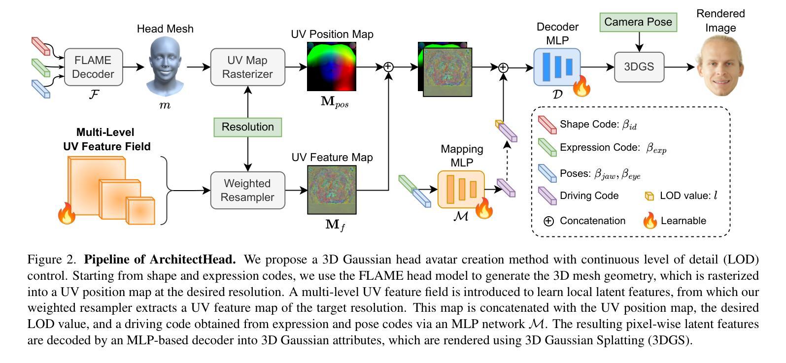 - ArchitectHead通过参数化二维UV特征空间的高斯并使用多层可学习特征图进行编码。