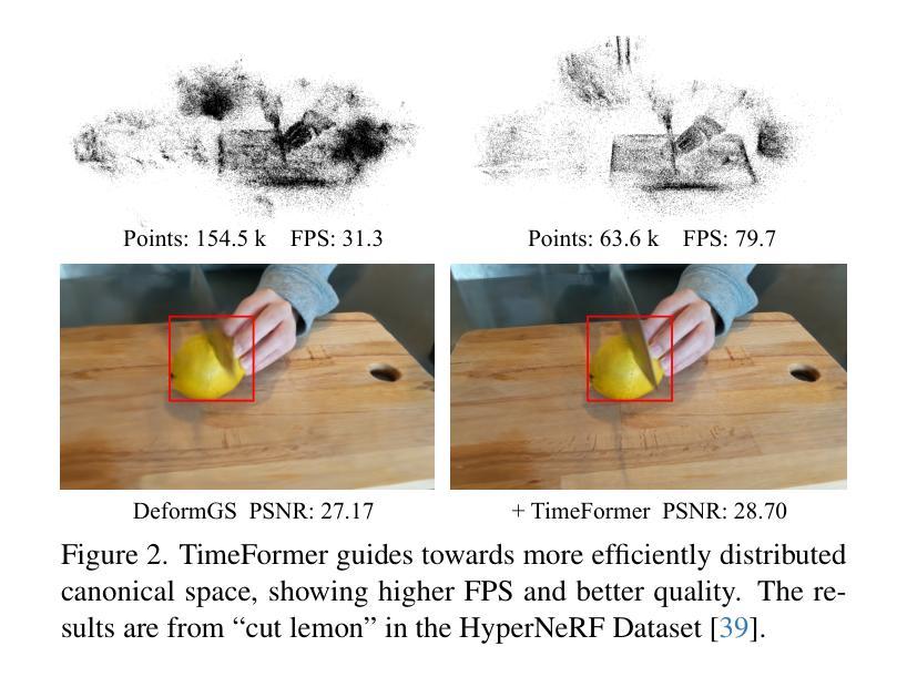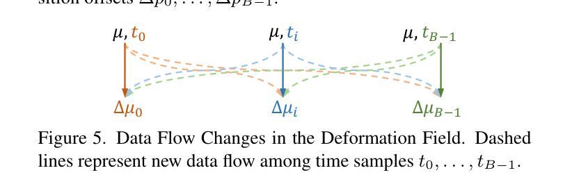 动态场景重建是计算机三维视觉领域的一个长期挑战。最近的方法通过将三维高斯拼贴技术扩展到动态场景,并利用运动流等显式约束来引导变形,来解决这个问题。然而,这些方法独立地从各个时间戳学习运动变化,使得重建复杂场景变得具有挑战性,尤其是在处理剧烈的运动、极端形状的几何结构或反射表面时更是如此。为了解决上述问题,我们设计了一个即插即用的模块,名为TimeFormer,使现有的可变形三维高斯重建方法能够从学习角度隐式地模拟运动模式。具体来说,TimeFormer包括一个跨时间Transformer编码器,该编码器可以自适应地学习可变形三维高斯的时间关系。此外,我们还提出了一种双流优化策略,将TimeFormer在训练阶段学到的运动知识转移到基础流中。这允许我们在推理阶段移除TimeFormer,从而保持原始渲染速度。在多角度和单眼动态场景的大量实验验证了TimeFormer带来的定性和定量改进。项目页面:https://patrickddj.github.io/TimeFormer/。